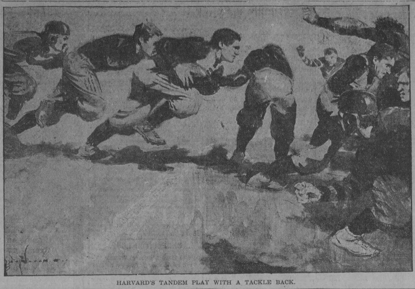 One page covers the team’s tandem plays. There were several versions of tandem formations that originated during the mass and momentum era. When the rules limited the number of players in motion at the snap, teams had their backs line up one behind another so they had a lead blocker, and one or more following backs to push the ball carrier. The illustration below shows Harvard giving the ball to the first back so his buddies could push him from behind.