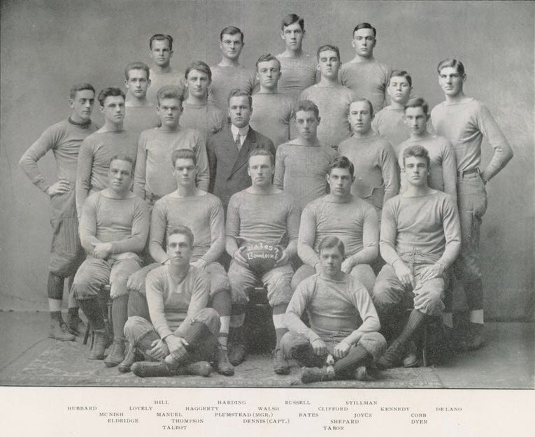 Back then, a school’s physical director coached all or most teams, taught physical education classes, and served as the athletic director. Thompson graduated from Bates in 1913, coached at Tilton Academy in 1913, and then replaced another Bates graduate at Moses Brown for the 1914-15 school year.