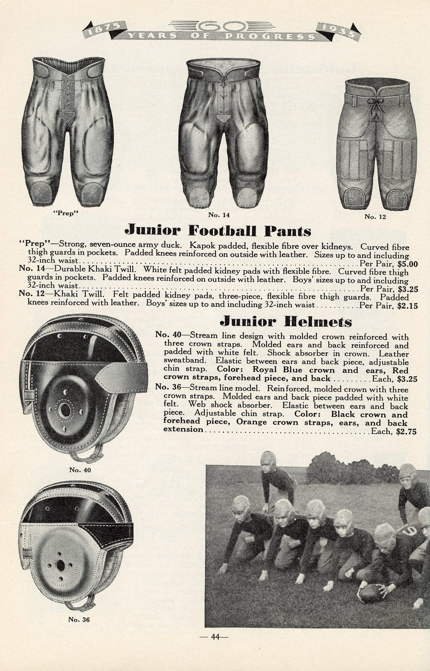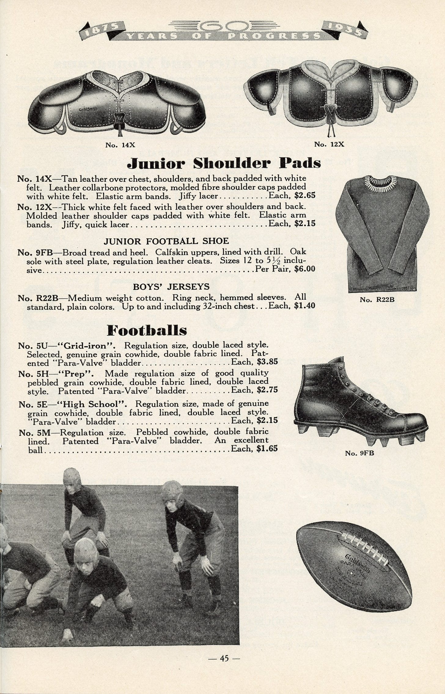 So, that brings the review of the 1935 GoldSmth Sporting Goods Catalog to an end. The cartoons allowed coverage of the history of each type of equipment, while the other pages revealed the state of the art of football gear in the mid-1930s.