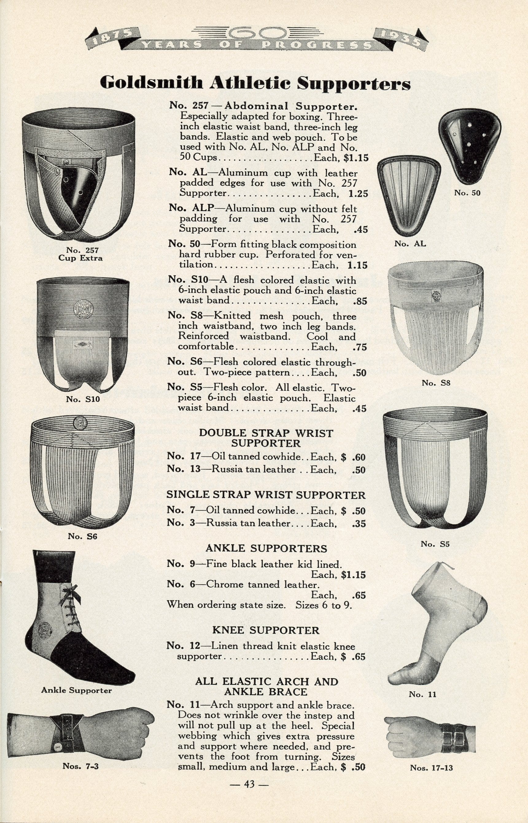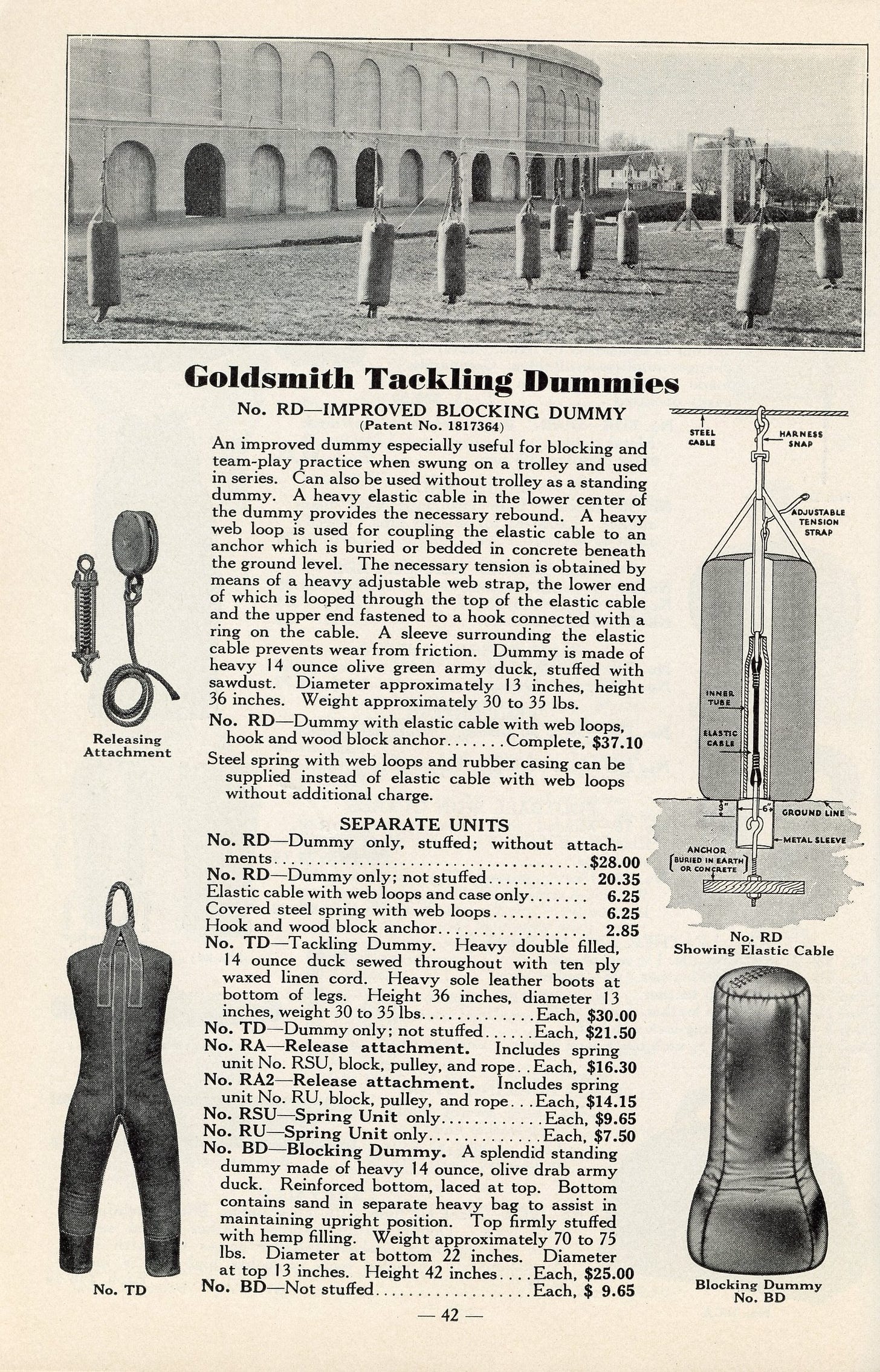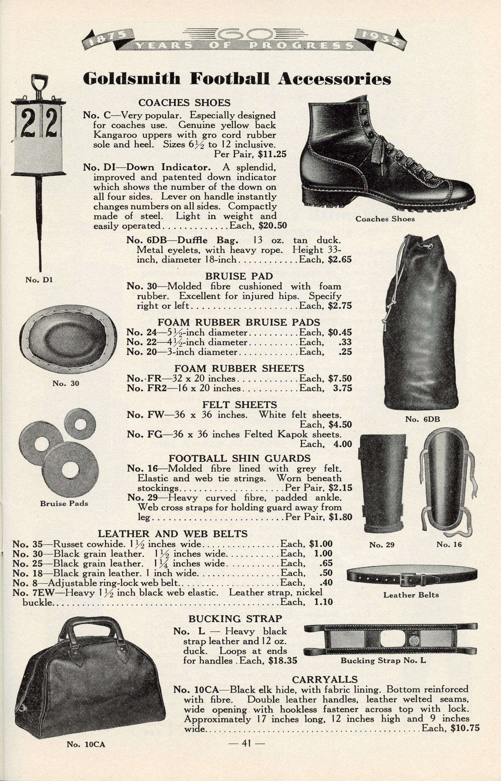 GoldSmith offered a down box that was actually a box that possessed amazing mechanics that allowed the same number to display on all four sides. Other exciting products included high-top coaching shoes, shin guards, and the bucking strap, which came without handles.