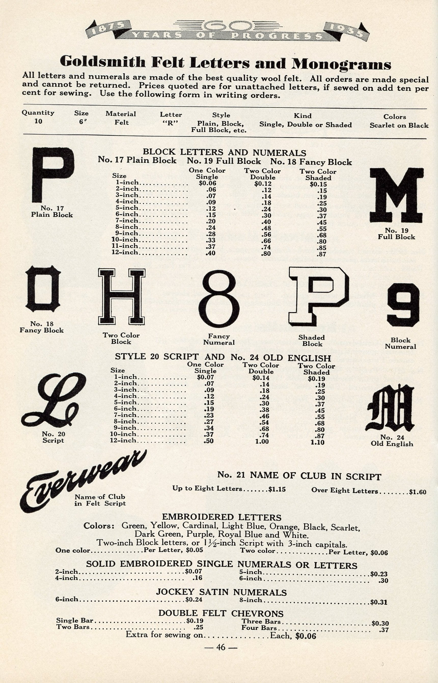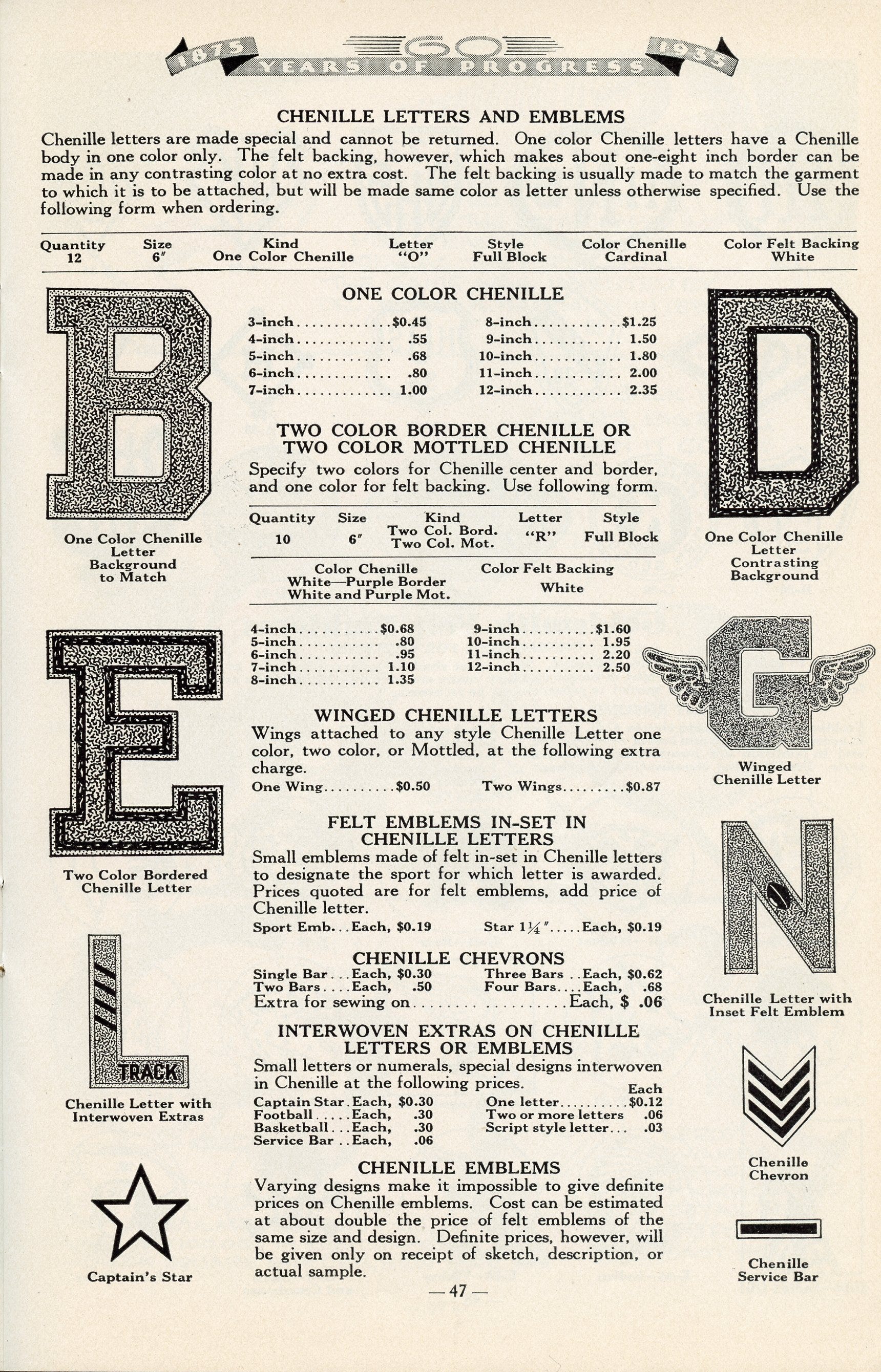The chenille letters and emblems were primarily used for letter sweaters in the 1930s since letter jackets only hit the market then. Chevrons found below and the numerals found on the previous page allowed athletic studs to be properly outfitted.