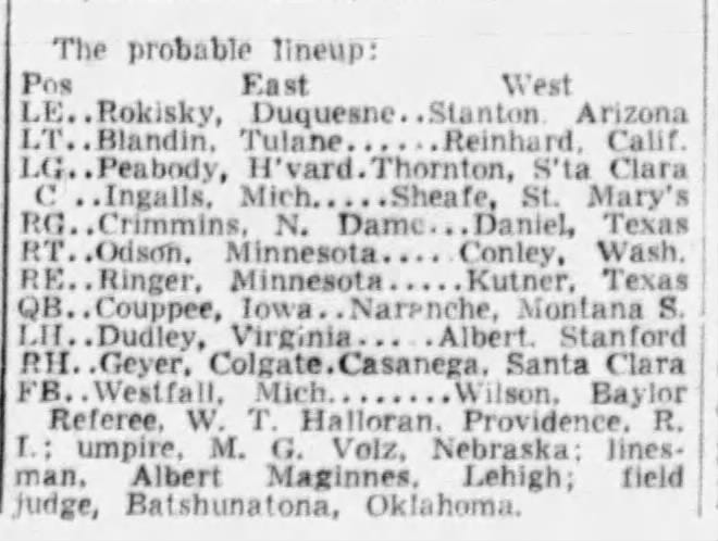 As was the nature of the time, the expected East starters included players from Duquesne, Harvard, and Colgate. At the same time, the West had gents from Santa Clara (two of those) and Montana State, in addition to the usual cast of major conference players.