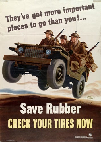 Due to World War II, the 1942 poster encouraged New Yorkers to conserve gasoline and rubber by taking the subway to college football games in New York City rather than using private transportation or a taxi. Tire rationing started nationwide in late December 1941, and gasoline rationing went into effect on the East Coast in May 1942.