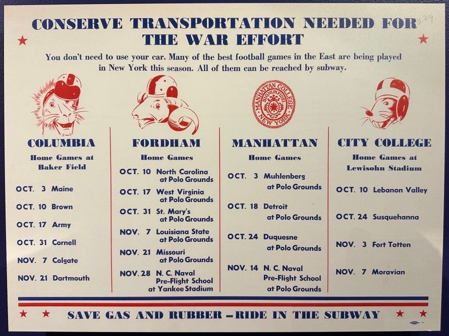 Big-time college football was still a thing in NYC in 1942. Yankee Stadium and the Polo Grounds were the sites of games between out-of-town teams, including the November 21 battle between Army and Princeton, when the game program included instructions for evacuating Yankee Stadium in the event of an enemy air raid.