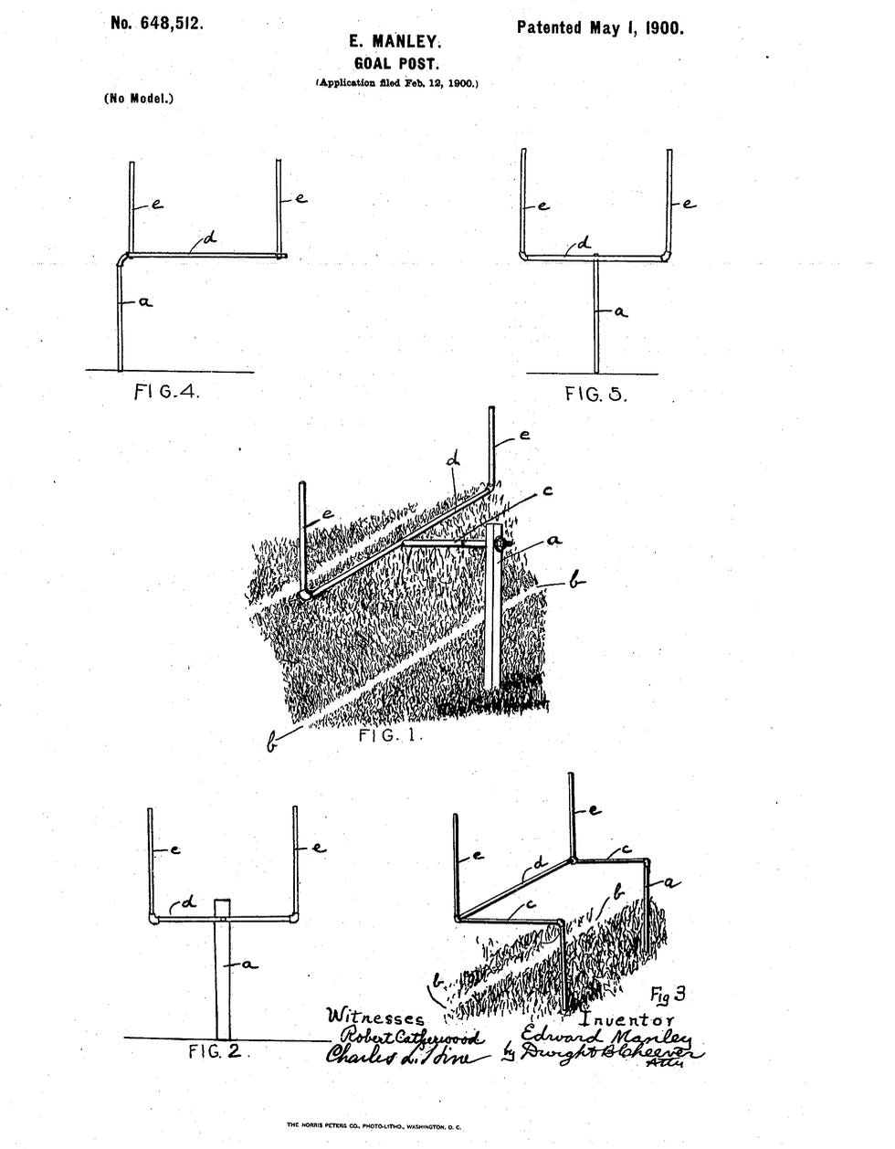 Despite the Crimson failing twice in similar circumstances, you can only fool some Harvard men once, and one of those one-time guys was Edward Manley. Manley filed for a patent on February 12, 1900, for a new type of goal post that might have changed the outcome of the 1899 game. Manley’s patent application described the new goal post design as serving two purposes: 1) to have the goal posts interfere with play as little as possible, and 2) to eliminate the safety risk posed by goal posts located on the goal line.