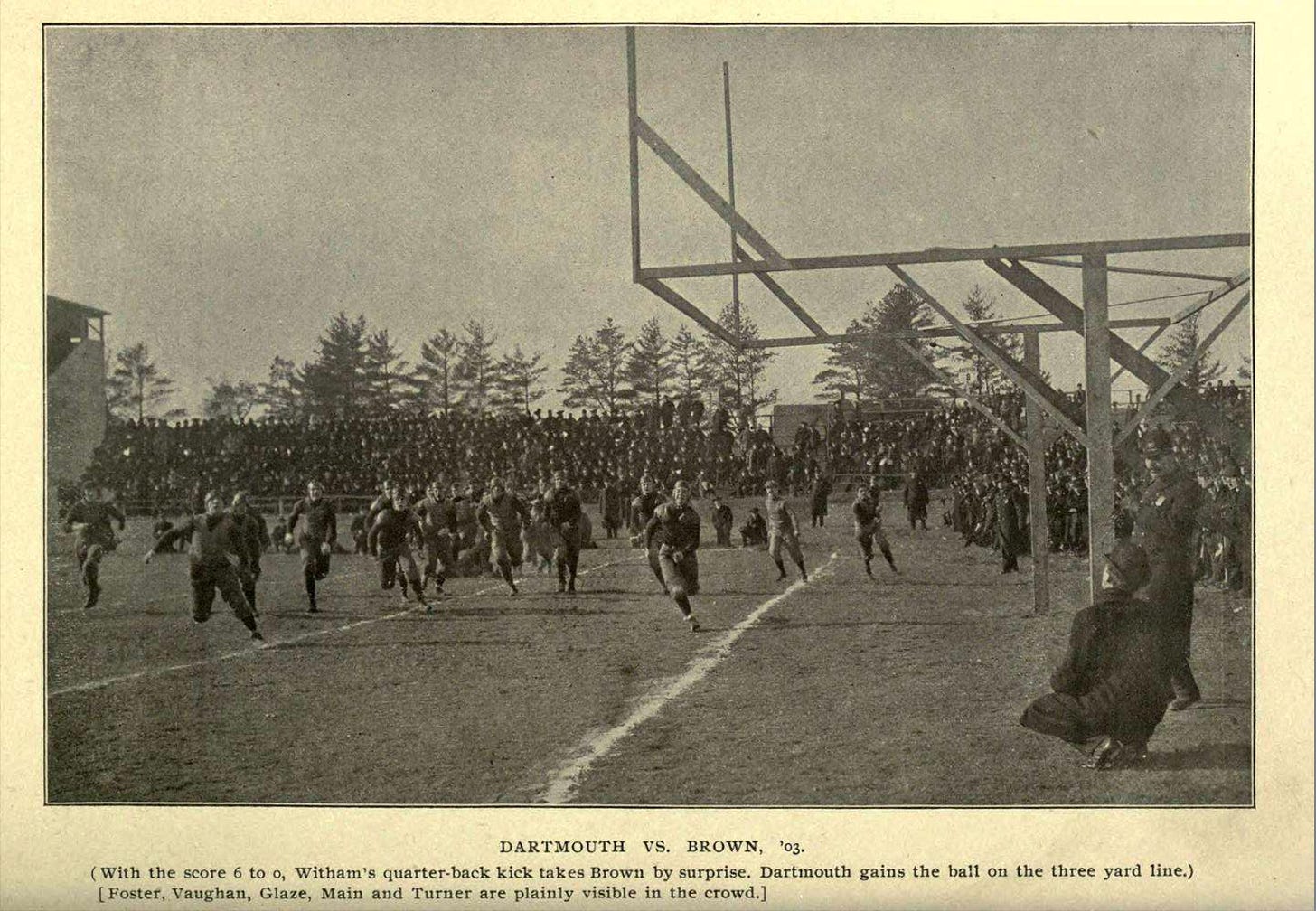 Poor Harvard suffered such problems against Yale in 1899 and 1903. The details about the 1899 game vary a bit, but the core story is consistent. On their third and final down with the ball sitting between the goal posts on Yale’s 2-yard line, the Crimson gave the ball to Ellis, a halfback, who ran directly toward a goal post, right into a mass of Yale defenders sturdied by the wooden post immediately behind them. Harvard did not cross the goal line, so the game ended in a scoreless tie, the only blemish on Harvard’s 1899 season.