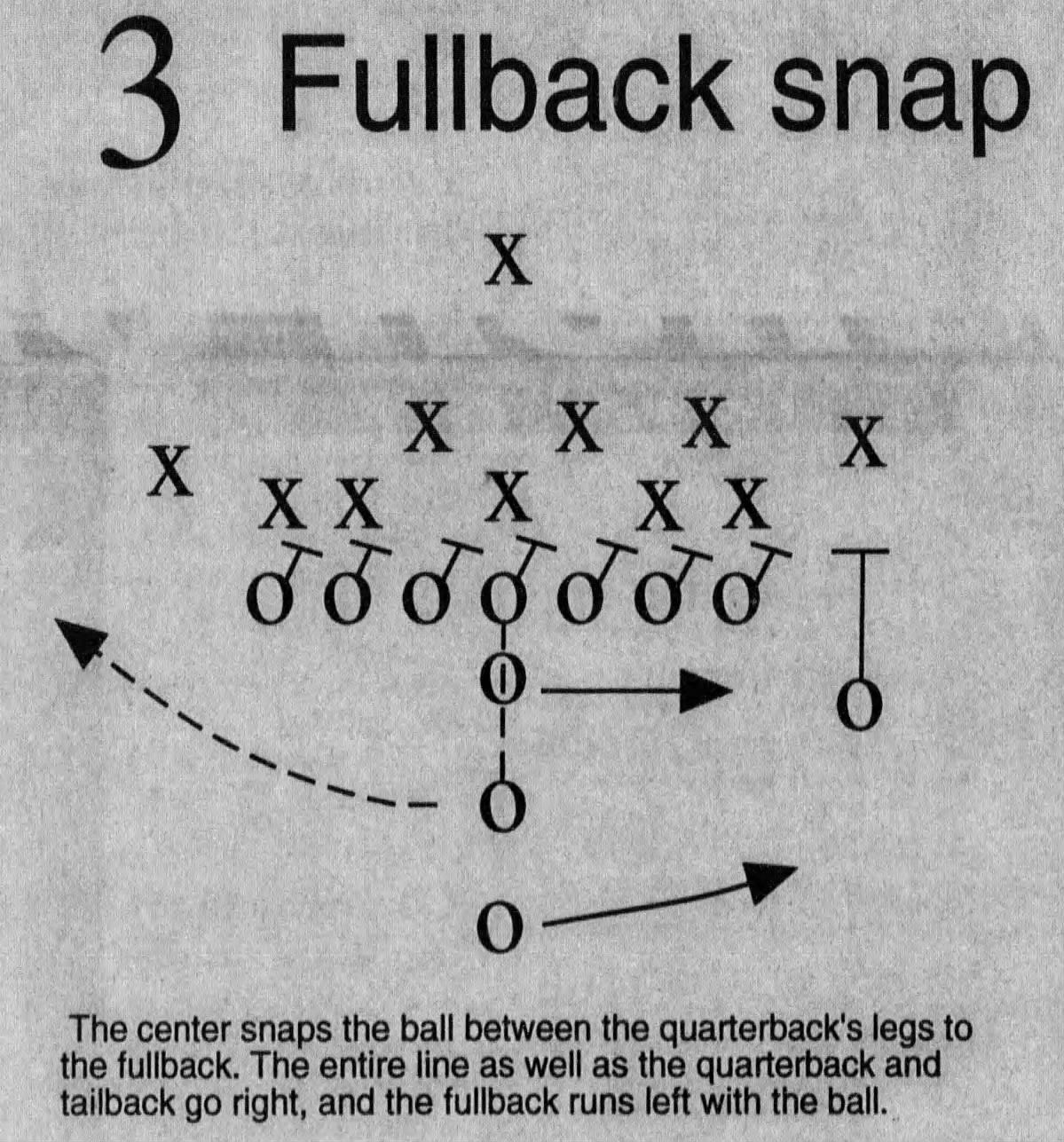 Third, teams snapped the ball to the fullback, or in recent years, the single back, who ran it up the gut, swept wide, or passed the ball. Teams commonly employed these plays in red zone situations.