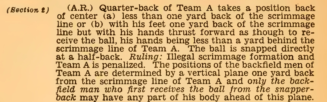 Arguments ensued over the play's legality since, by then, the rules required the quarterback to be at least one yard behind the line of scrimmage for another player to receive the snap legally. In effect, the quarterback could not have his hands under center if another player received the snap.