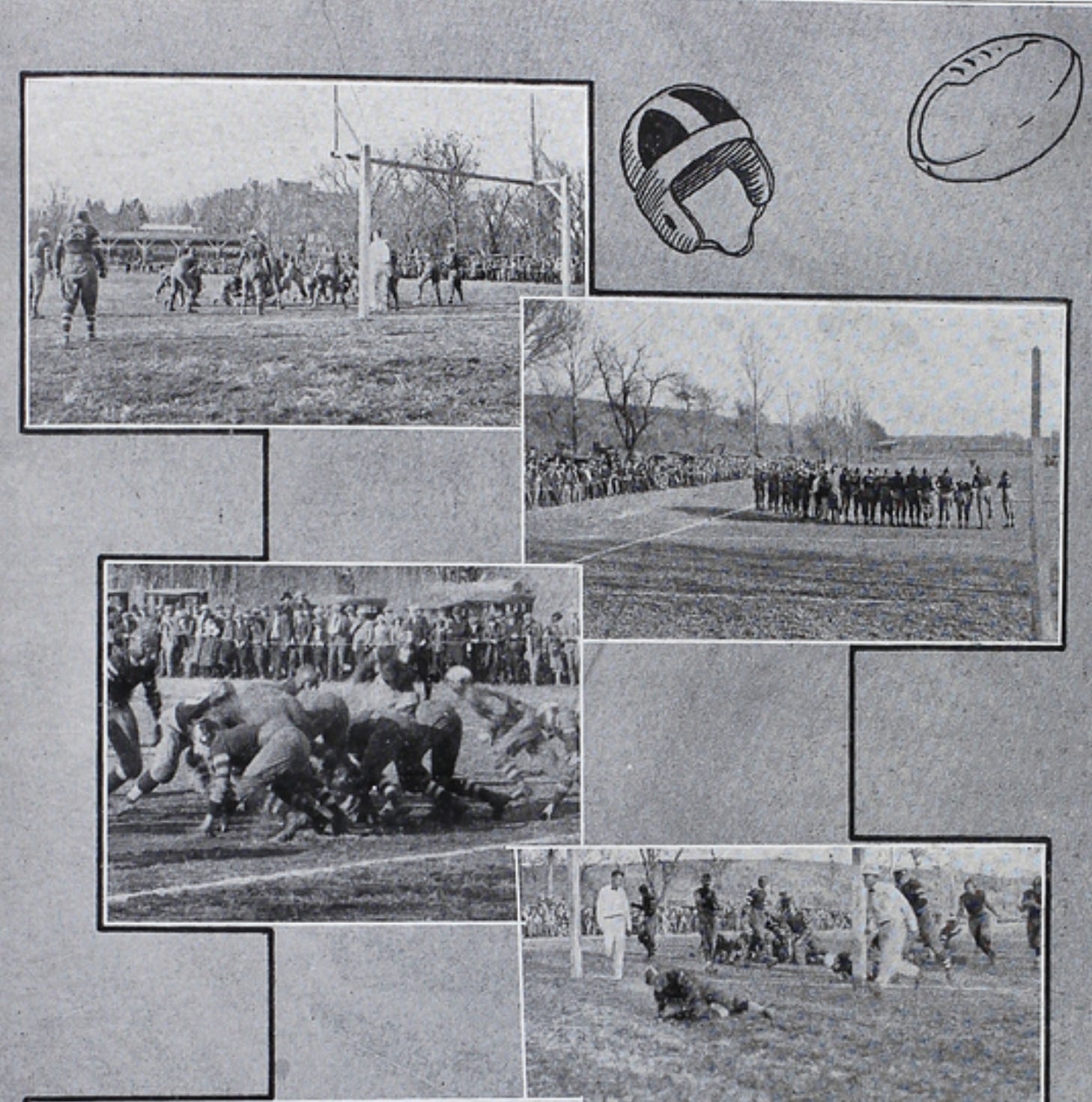 Their late-season games included other elements no longer seen on football fields. In St. Mary's 32-0 win over Drury, Drury kicked off, and St. Mary's covered the ball on the 10-yard line. On the first play from scrimmage, a St. Mary's end took the ball on a sweep and ran for a 100-yard touchdown on the old 110-yard field. Then in their 17-10 Thanksgiving Day victory over Doane, St. Mary's scored their first touchdown when the umpire blew his whistle to signal a penalty. Unfortunately for Doane, play stopped only when the referee blew his whistle, not when the umpire did so, but the Doane players stopped pursuing the runner and allowed him to score. (See the earlier story on officials' whistles, horns, guns, and penalty flags.) Later in the game, St. Mary's tried an onside kick from scrimmage in which one of their players recovered the ball and ran it in for a touchdown.