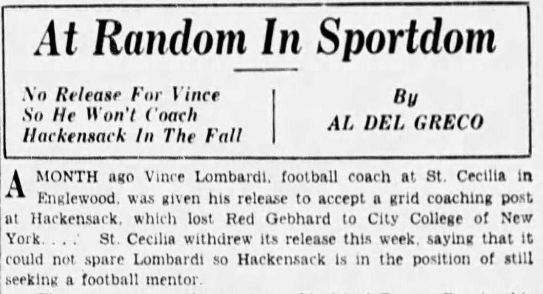 Unfortunately for Lombardi and Hackensack, St. Cecilia rescinded his release a few weeks later, so he returned for the 1945 season.
