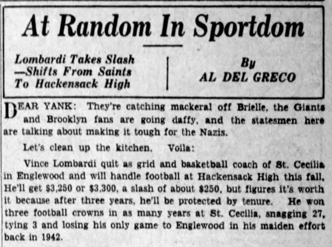 But all of that might not have happened, and his career could have taken a different path if events had played out differently. Lombardi lost his first game as a football head coach in 1942 before going undefeated the rest of the season and in 1943 and 1944. Despite the success, he resigned from St. Cecilia in May 1945 to take the job at Hackensack High, where he would be eligible for tenure.