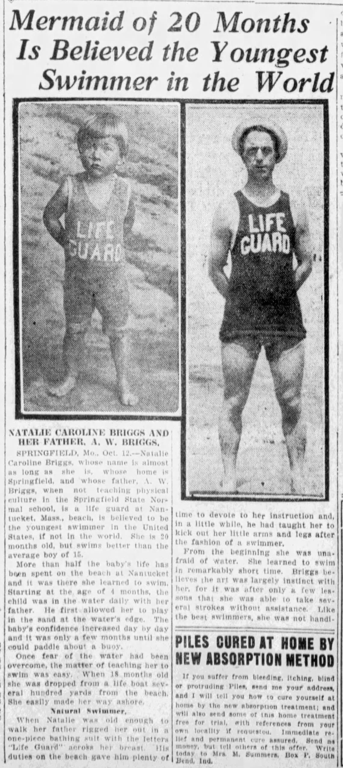 The only thing keeping this story from becoming a Factoid was my looking into A. W.’s background; perhaps he did something else of interest that would be worth describing to readers. When I looked into A. W., I found that some claimed his daughter was the youngest swimmer in the country at 20 months old during the summer of 1913.