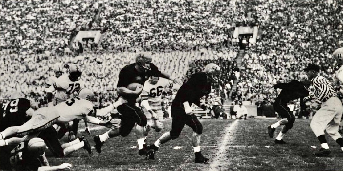 Following on yesterday’s theme concerning helmet logos, I wanted to look at the time between the 1948 Los Angeles Rams busting out their horns and college teams adding helmet logos. To really determine the adoption curve, I’d have to find images for hundreds of college teams over a few decades, but even I wouldn’t do that, so I took a far narrower path, looking only at the Rose Bowl teams starting in 1949.