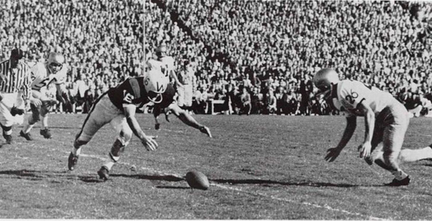 1960: Washington had plain gold helmets, while Wisconsin had 1) TV numbers, 2) a W on the helmet's front, and 3) a W on the back (not visible in the image below, but it appears in yesterday’s Tidbit). Both teams had TV numbers on their sleeves.