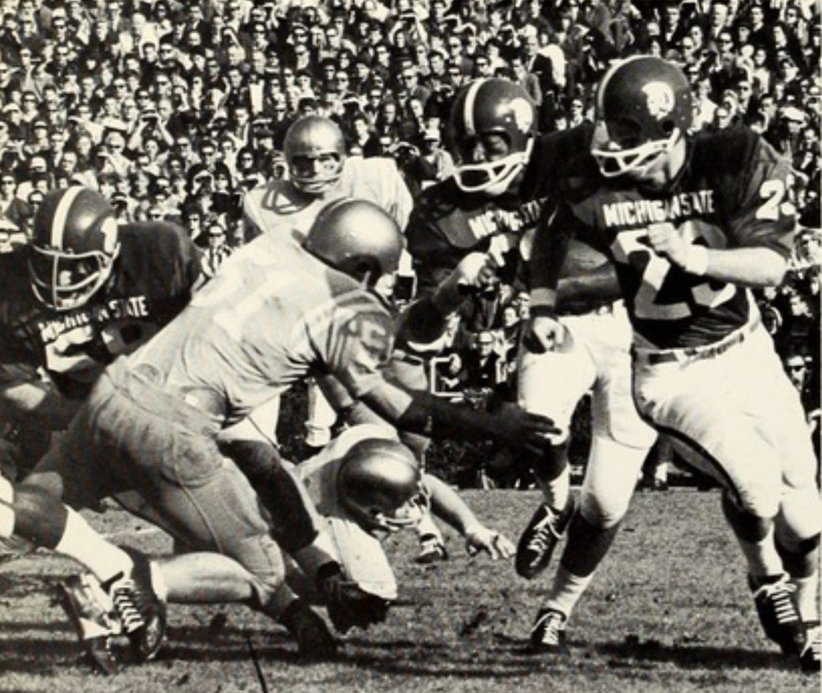 1966: Michigan State was the second Rose Bowl team to bear a logo when they appeared with a Spartan head on either side of their helmets, while UCLA was logoless again. Both teams had TV numbers on their sleeves.