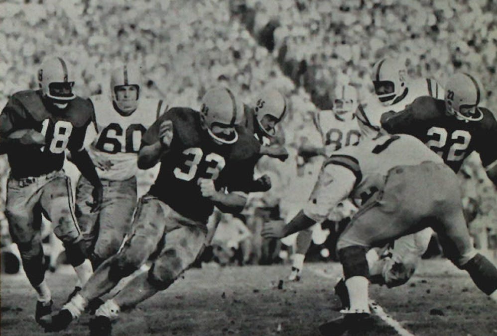 We’ll end the review with the 1966 game since the Rose Bowl teams were clearly slow to adopt helmet logos. Adopting TV numbers on the sides of helmets in the mid-1950s likely slowed the process further. However, few schools today lack logos or do not plaster their helmets with award decals, so the plain plastic helmets of the 1950s are long gone from America’s campuses.