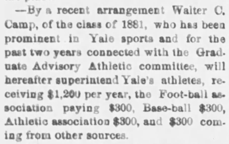 Camp recommended and pushed through a new rule requiring teams to gain five yards in three downs in 1882, so football was still an infant in 1883 when Camp made $1,200 per year running Yale's athletic organization. That may not seem like much money, but it was $35,364 in 2022 dollars or $35K more than any Yale athlete made. Just a few years later, students like Amos Alonzo Stagg bussed tables and worked odd jobs to put themselves through Yale, while the wealthy Camp benefitted financially from his efforts.