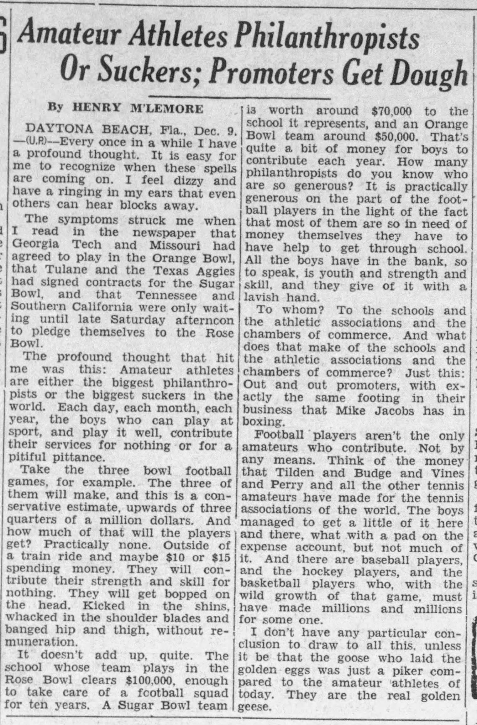 McLemore, who was a vociferous supporter of the Japanese internment camps during WWII, had his own issues but was spot on about this one. The late 1930s saw SEC players become the first to receive formal athletic scholarships, which may have been reasonable compensation until television money came along. Still, things have been out of balance for decades, so recent changes may address those problems.