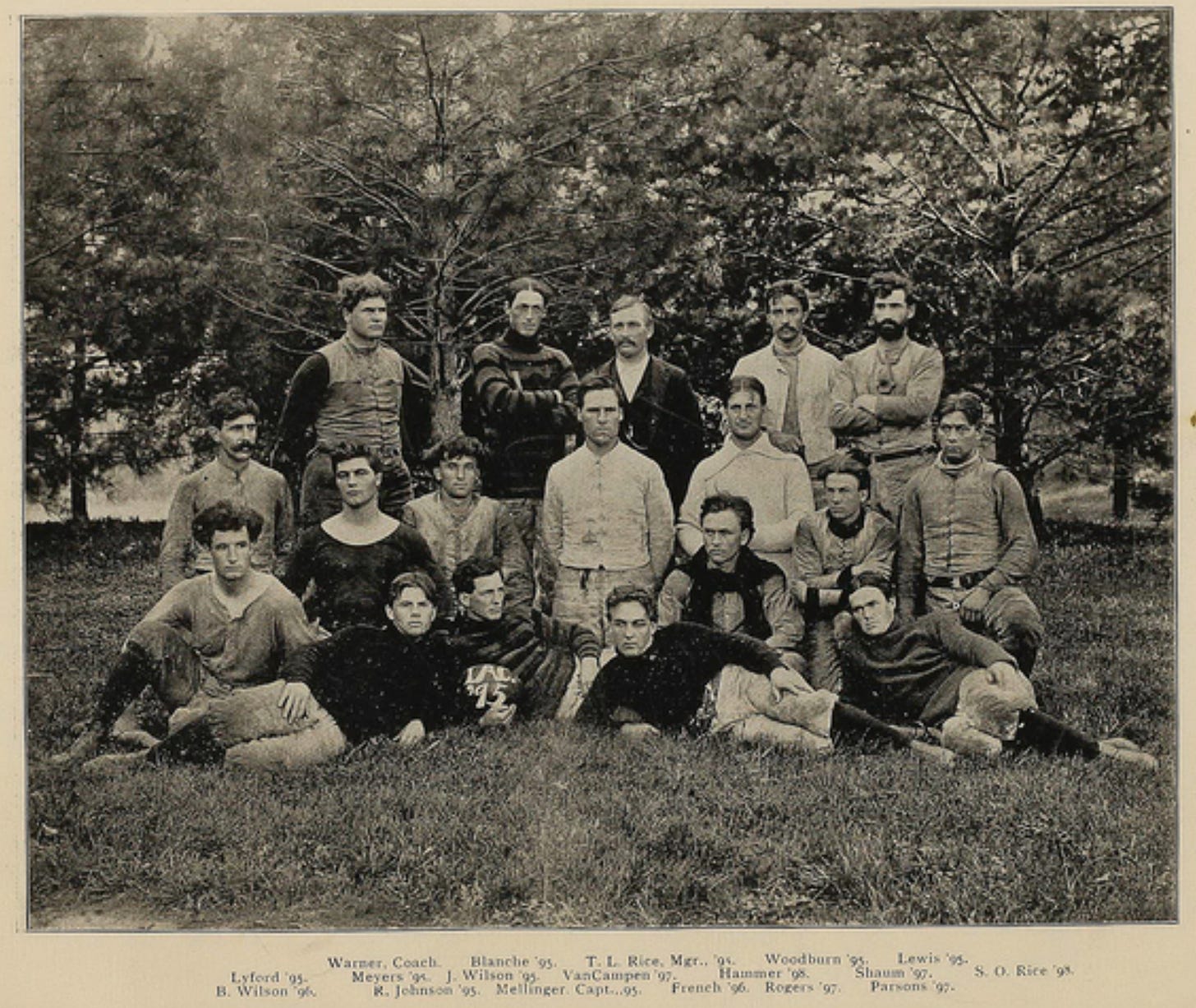 Today, I want to focus on the “not uniform” part, which was more typical of the underfunded than those with the big bucks. Some university teams displayed a lack of uniformity before 1900, at least some of those out on the prairies. The 1895 Iowa State team below had Pop Warner as its coach, but lacked uniforms, nonetheless.