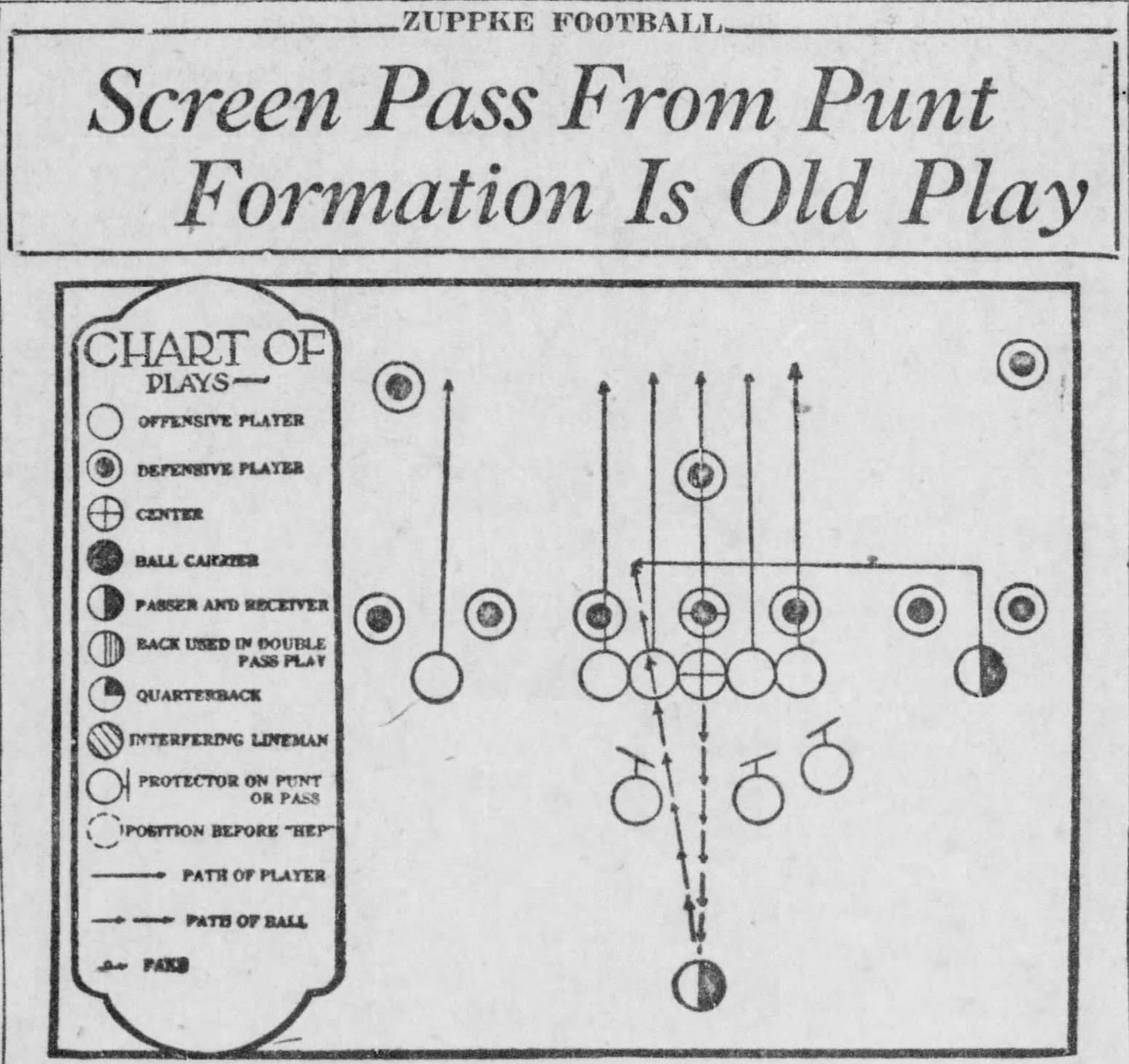 Zuppke's conceived his screen pass similarly. He released his ineligible linemen to head straight downfield and block whoever came their way while a back or end slipped behind them to take the pass and follow the blockers. Since his design kept the blockers and receiver moving rather than being stationary, it was more successful and adaptable when downfield blocking rules changed.