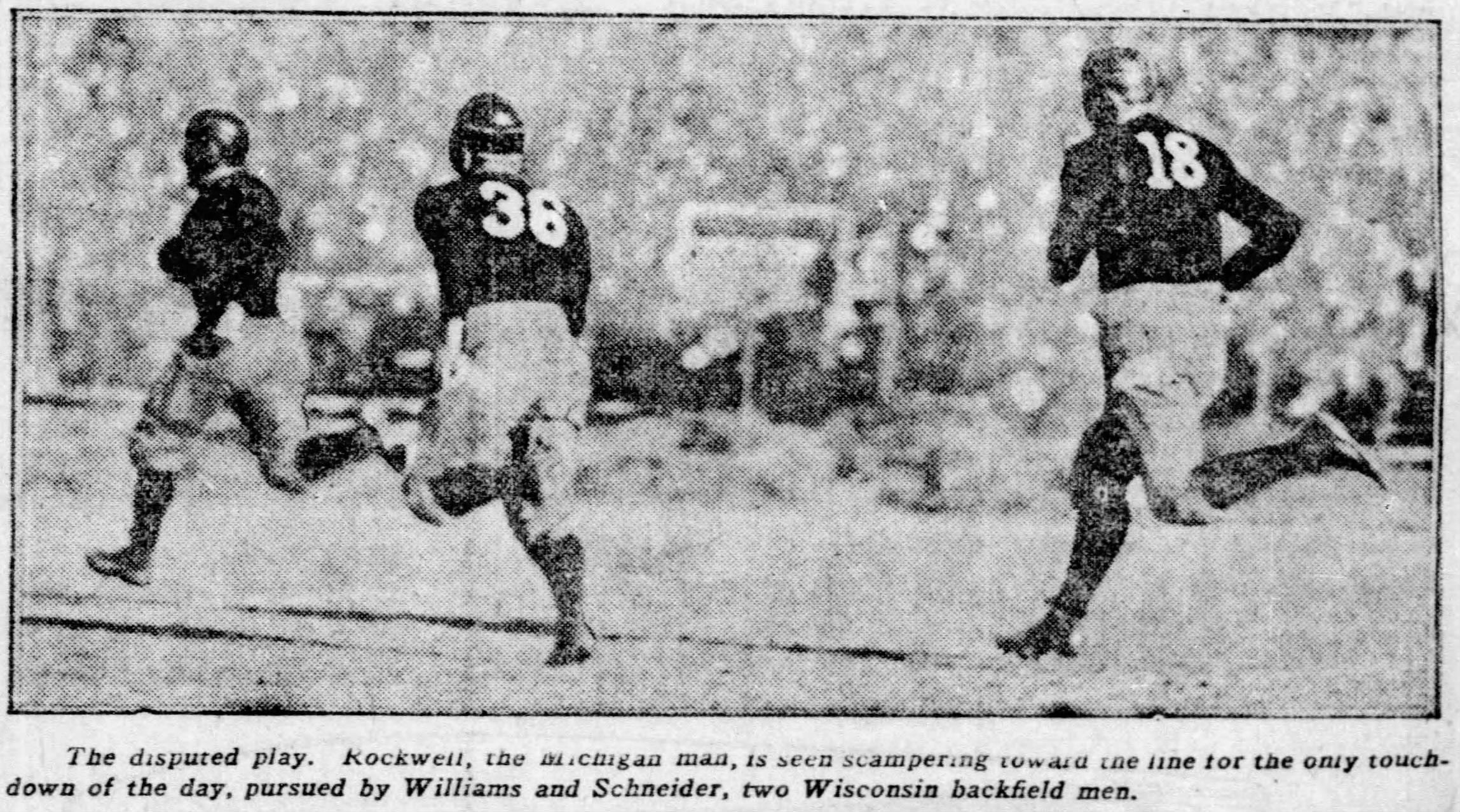 Wisconsin’s crowd went wild. Wisconsin’s captain claimed he had Rockwell in his grasp. Wisconsin fans argued that Mumma had marked the spot of the tackle with his foot to indicate that Rockwell was down, or that he blew his whistle, which he did not carry, but the touchdown stood.