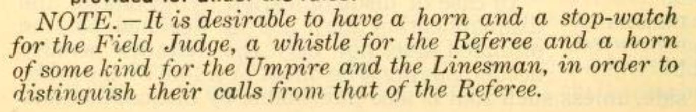 Referee Walter Eckersall trailed the play to the end zone before conferring with the Field Judge, Mumma. At the time, referees were the only officials to carry whistles; the other officials tooted horns, which did not stop play like the referee’s whistle.
