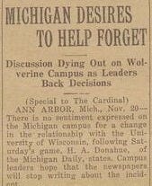 The controversial call remained a hot topic for the next week, with accusations back and forth. Wisconsinites denied that Jones had pulled a pistol, and as a Hall of Fame track and cross-country coach, Jones was familiar with starter’s pistols but was otherwise not known to pack heat for Wisconsin home games. Some suggested that Wisconsin end its athletic relationship with Michigan, but cooler heads prevailed by aiming their ire at Eckersall, not Michigan. Jones pledged that Eckersall would never work another Wisconsin game as long as he was AD, and they didn’t, though Jones resigned his AD role the next year, remaining as track coach until 1948.