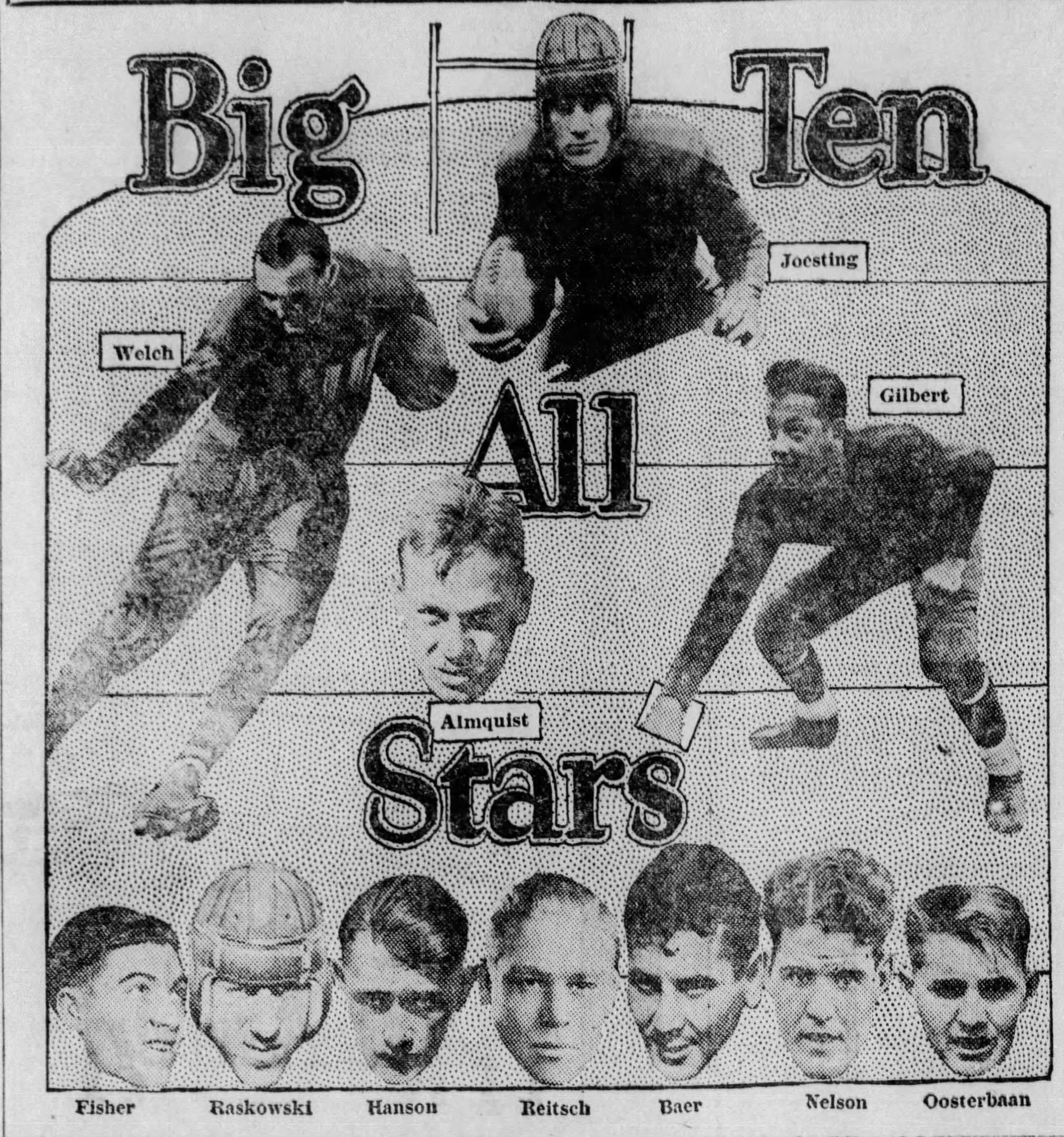 I feel comfortable claiming to be in the top one percent of goofballs who look at one-hundred-year-old yearbooks and sports pages for information and images on old football teams. That experience allows me to note that newspaper and publicity folks in the Teens and Twenties liked to create collages of teams comprised of the players’ faces. The layout allowed the squeezing of many faces in limited space. Here’s an example.