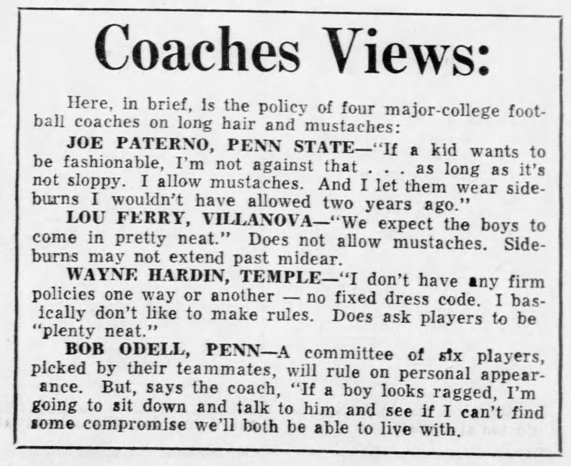 Team rules regarding facial fuzz and hair length varied widely over the next decade or two before most realized a player's facial hair was no more important than their eye color in determining how well they performed on the gridiron.
