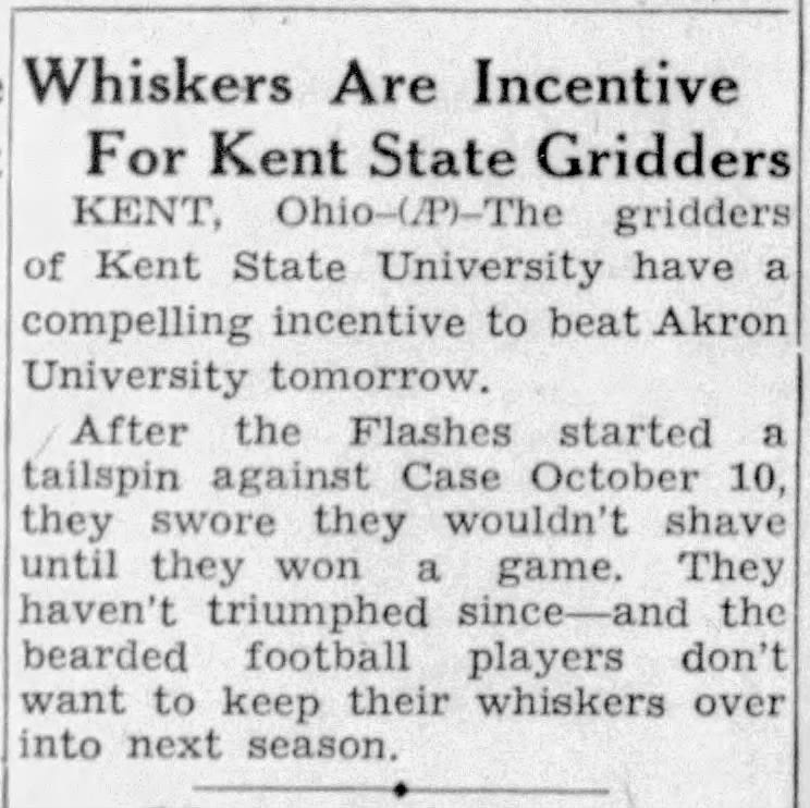 Position groups and entire teams got into the action when on losing streaks by vowing not to shave until they won a game. The 1931 CCNY team, the 1941 Kent State, and the 1955 Missouri teams all made such bets. Unfortunately for the Kent Staters, their next victory did not come until they topped Findlay by a close shave in October 1942.