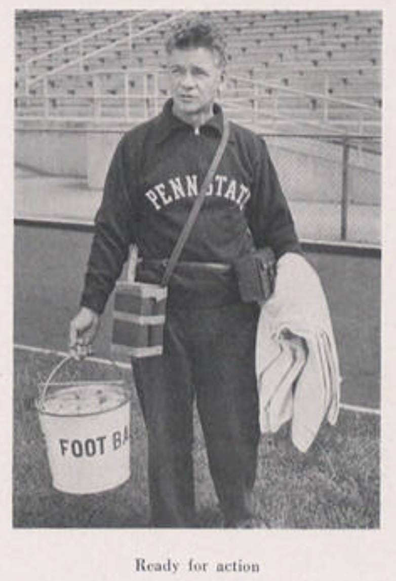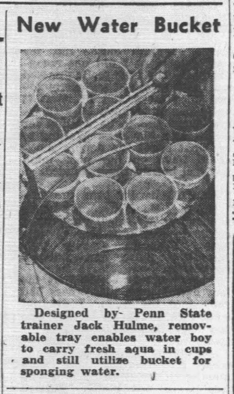 So, I recently came across a 1946 image and caption regarding a water dispensing kit invented by Penn State's trainer, Jack Hulme. Hulme's invention attempted to solve the age-old problem of trainers taking a water bucket onto the field from which players refreshed themselves by scooping water with a shared ladle. The same bucket often contained a sponge to squeeze over players' heads to help them cool down. The same sponge wiped blood from cuts and bloody noses in the days before face mask-wearing was widespread. After cleaning the bloody mess, they tossed the sponge back into the water bucket, from which future ladling for refreshment occurred.