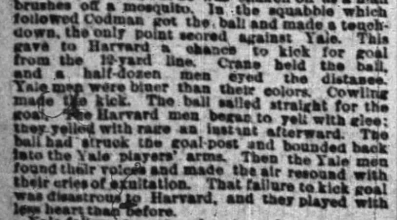 Our fifth example of an early poster or doink came in an 1883 game not involving Columbia. The game featured Harvard and Yale, and when Harvard kicked a poster, the Crimson seemed to fall apart, eventually losing 23-2.