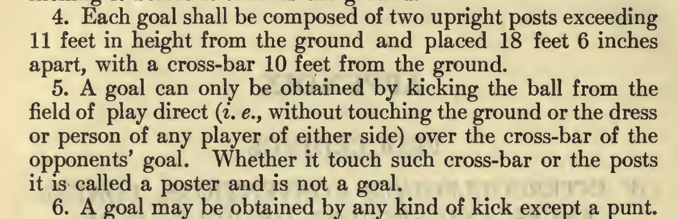 Searches for phrases such as “hit the goal post” and “struck the goal post” got things going and reminded me that rugby and football had a term for doinks in the pre-doink days. When the Intercollegiate Football Association adopted football’s first rules on November 26, 1876, they copied nearly verbatim the 1876 Laws of Rugby, including Rules 4 to 6 covering the goal posts and goals: