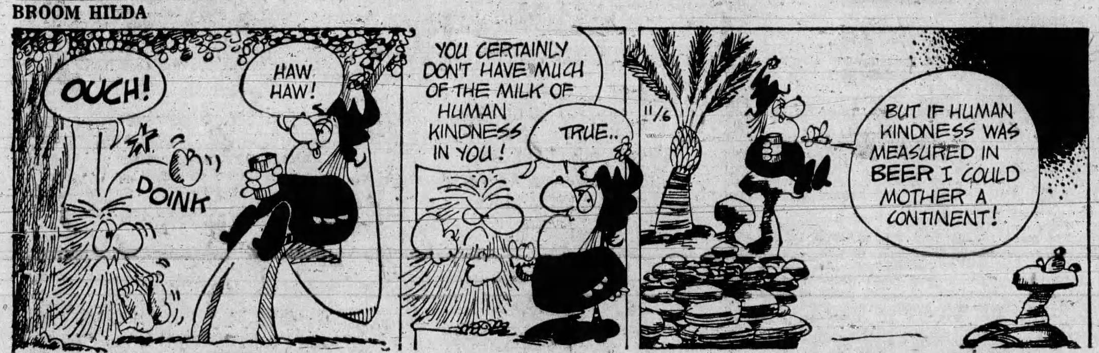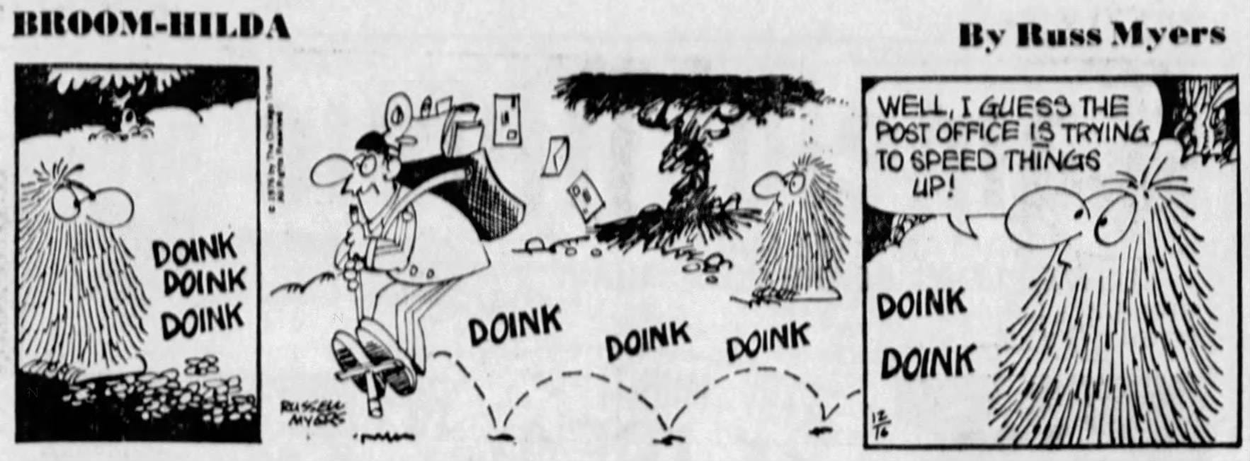 The simpler question to answer is the first: when did someone first call a doink a doink? Most early appearances of doink in newspapers were typos of words like ‘doing’ and ‘drink’. Cartoon dialogues of Central or Eastern Europeans pronouncing the word ‘doing’ as ‘doink’ came later. ‘Doink’ then transitioned into the sound made when one object hits and bounces off another, as seen in the Broom Hilda cartoons of the 1970s.