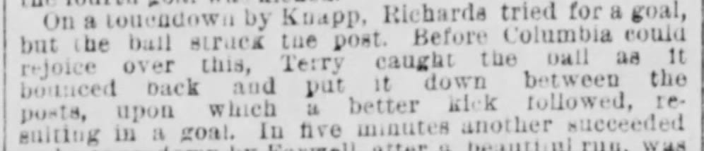The 1880 season saw Columbia benefit when Harvard’s Kent shanked the ball, hit the goal post, and watched it return to sender.