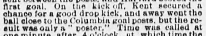 For the 1881 season, the IFA revised its rules so kicks striking the goal post and bouncing over the crossbar counted as a goal, making posters the equivalent of modern doinks. In 1882, Columbia made it four for four in doink/poster appearances when Yale posterized them. Since missed kicks were live balls in those days, when Yale booted a ball that struck the post and bounced back to a boy in blue, the rules allowed him to run it in for another touchdown. The Elis then scored a goal on the second kick.