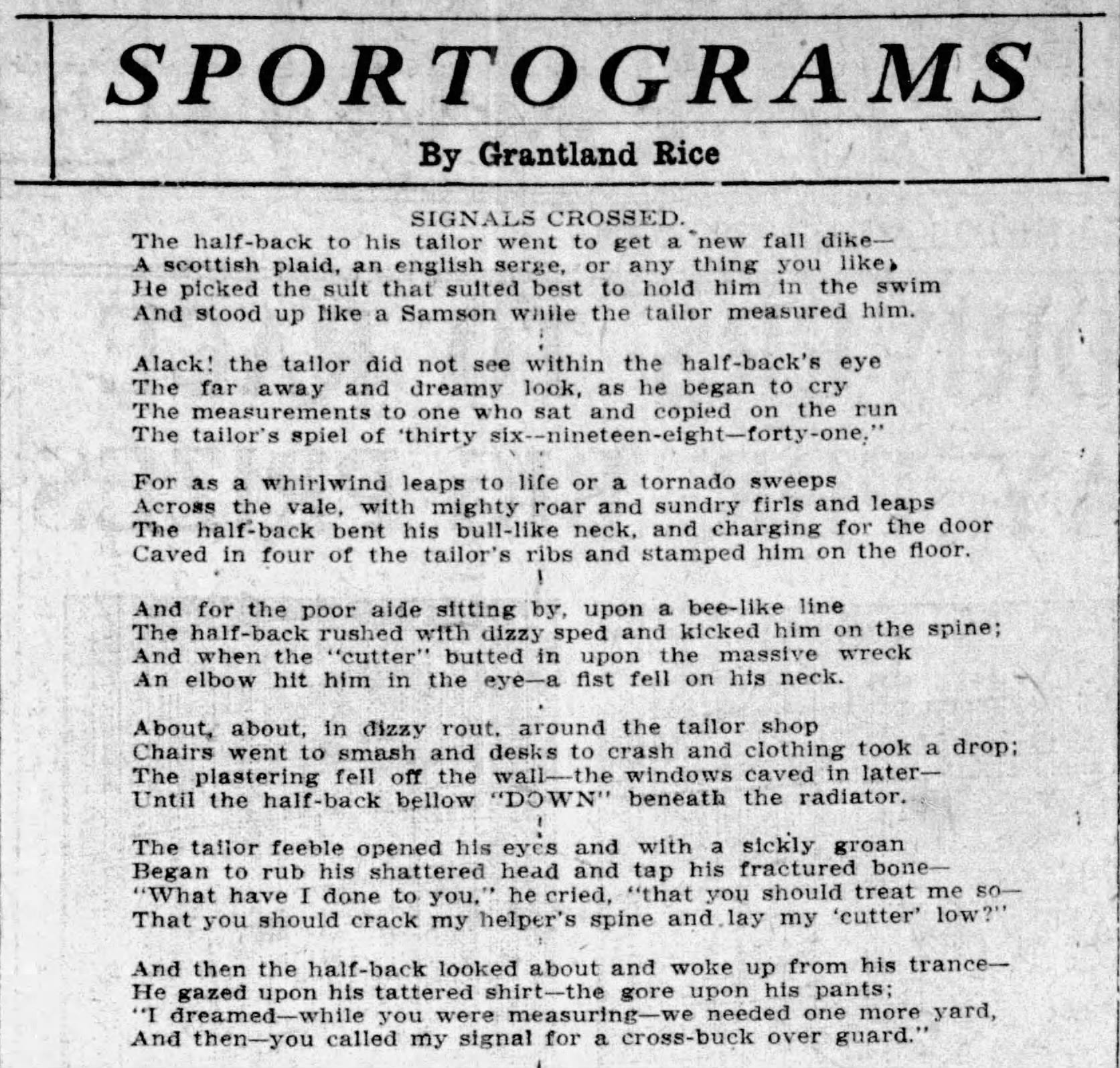 While not Rice's finest work, it provides an amusing example of what happens when signals get crossed. In this case, a halfback a tailor was measuring for a suit hears a series of numbers called out and reacted inappropriately to the situation.