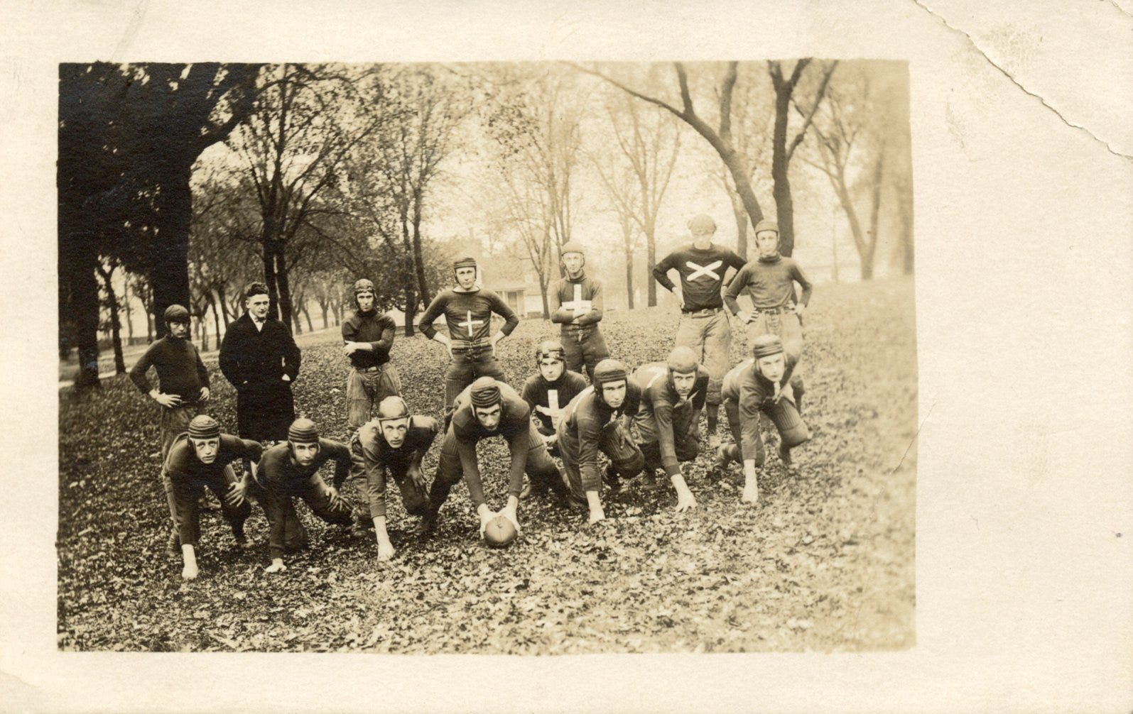 Teams getting their signals crossed has been in the news lately—maybe you heard about it. A different group of high schoolers, seen below, got their signals crossed around 1910. They played when only a few teams had ever worn numbers on their jerseys, yet some of the guys have addition or multiplication signs on their chests.