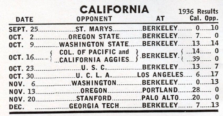 I published an article about football doubleheaders in January 2020. Those interested in learning how those games emerged in the late 1920s and continued through the 1930s, with Cal being their top proponent, can read the article linked below.
