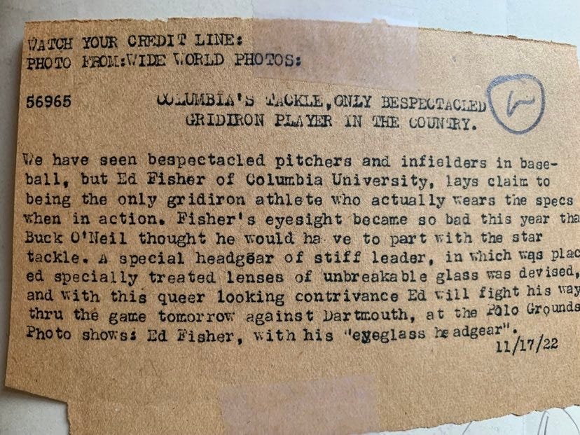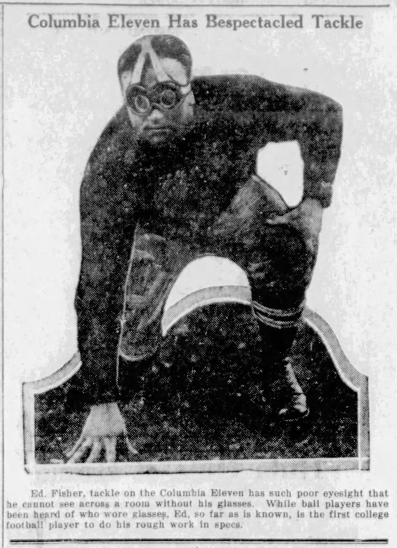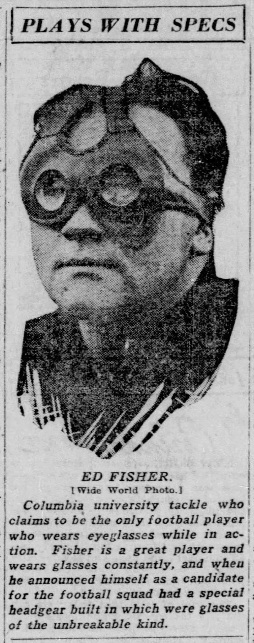 However, Fischer encountered significant problems with his vision entering the season, and in the days before contact lenses and face masks, it appeared he would be unable to play. Instead, Columbia developed a custom set of goggles with lenses made of unbreakable glass that allowed him to play. The goggles gave him an unusual appearance, but they allowed him to play, leading to a story and several images sent to the press. One or the other of the photos appeared in newspapers across the country.