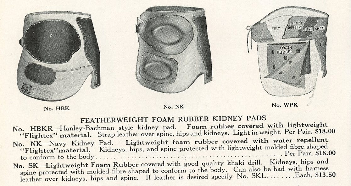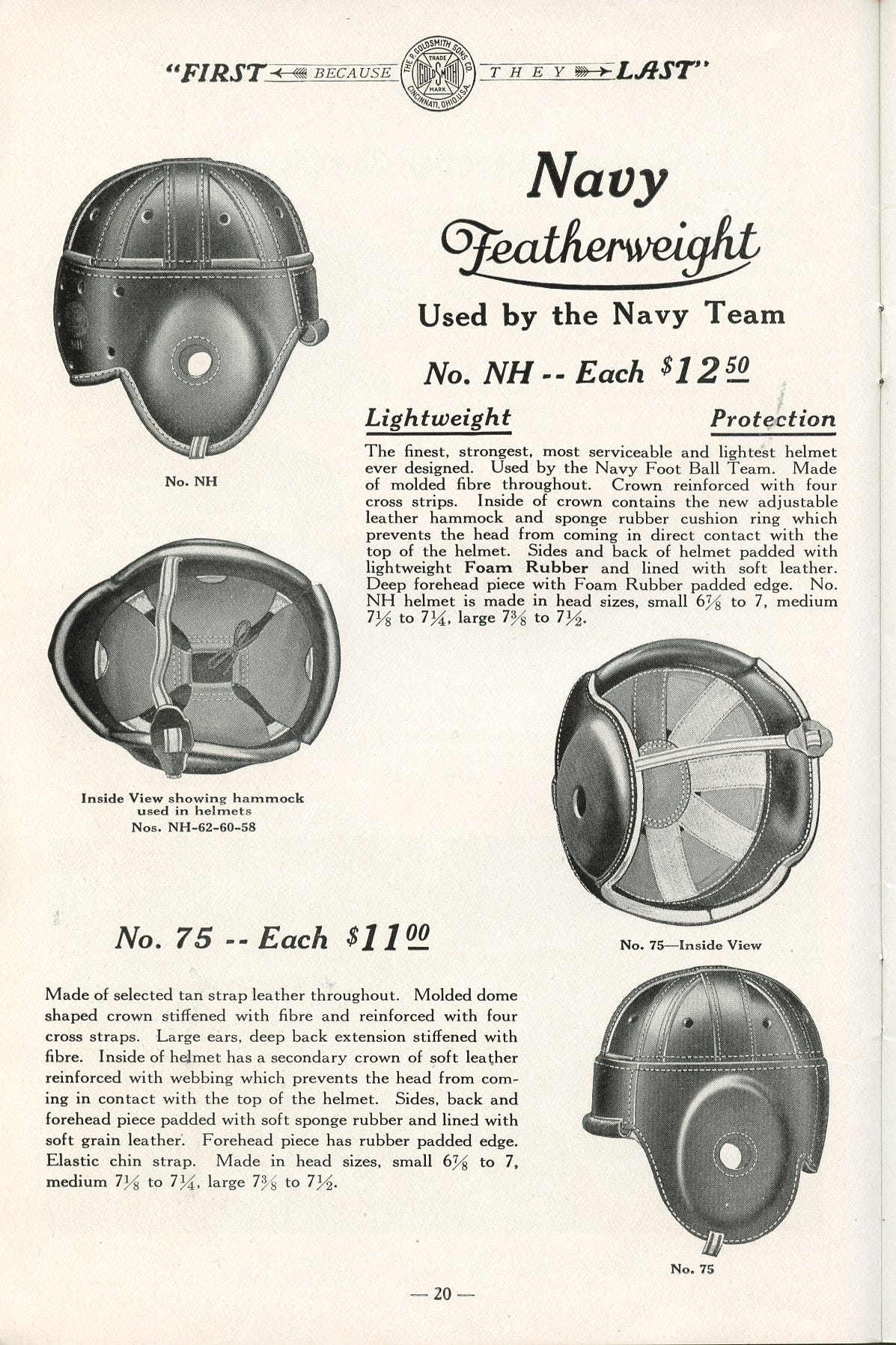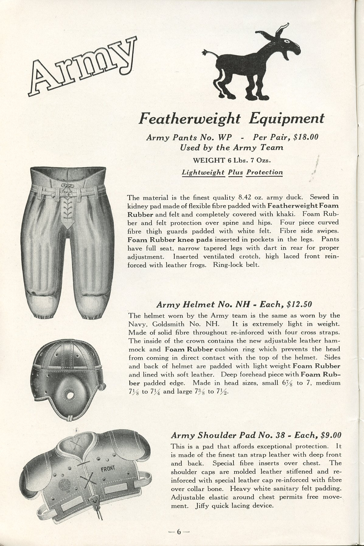 GoldSmith applied for patents in 1925 for foam rubber pads in helmet interiors, but featherweight lines of 1927 represented the first concerted effort to use sponge or foam rubber and fiber wherever possible. GoldSmith was the first to produce disintegrating pants, which separated the hip, thigh, and knee pads into separate units rather than building them into the pants.