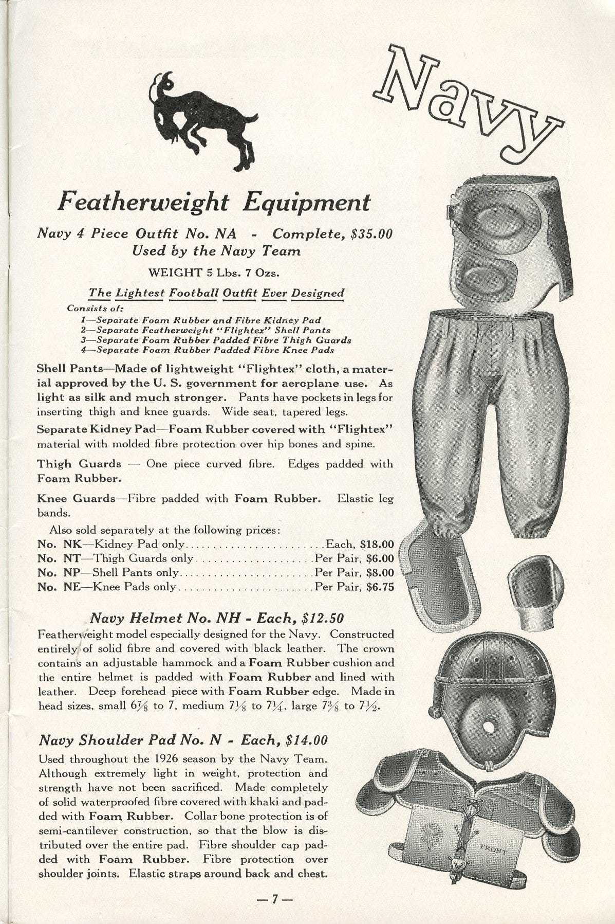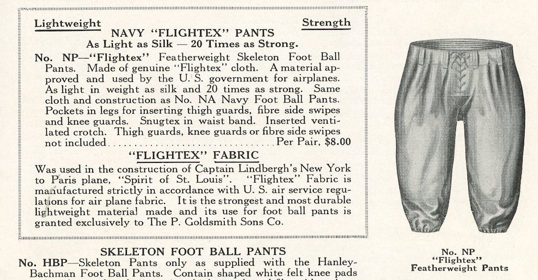 GoldSmith enjoyed the exclusive right to produce football pants using government-spec Flightex cloth, the same material used on Navy planes and on Lindbergh’s Spirit of St. Louis. There was no better recommendation than Lindbergh once he crossed the Atlantic in May 1927.