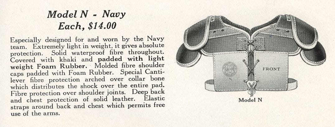 A few years ago, I learned about Lt. George E. Mott, who was the Naval Academy’s team physician in the 1920s and became interested in preventing injuries, not just treating them. His interest led to working with a sporting goods manufacturer on new equipment designs featuring fiber crowns in helmets, hip and kidney pads, and thigh and shoulder pads. He also replaced felt and other padding materials with sponge or foam rubber, which was lighter, more protective, and was not water absorbent. They also made new pants of airplane cloth, the lighter version used on airplane wings, not the tougher fuselage cloth. The combination meant players were better protected and not anchored down by their gear, which weighed less than six pounds.