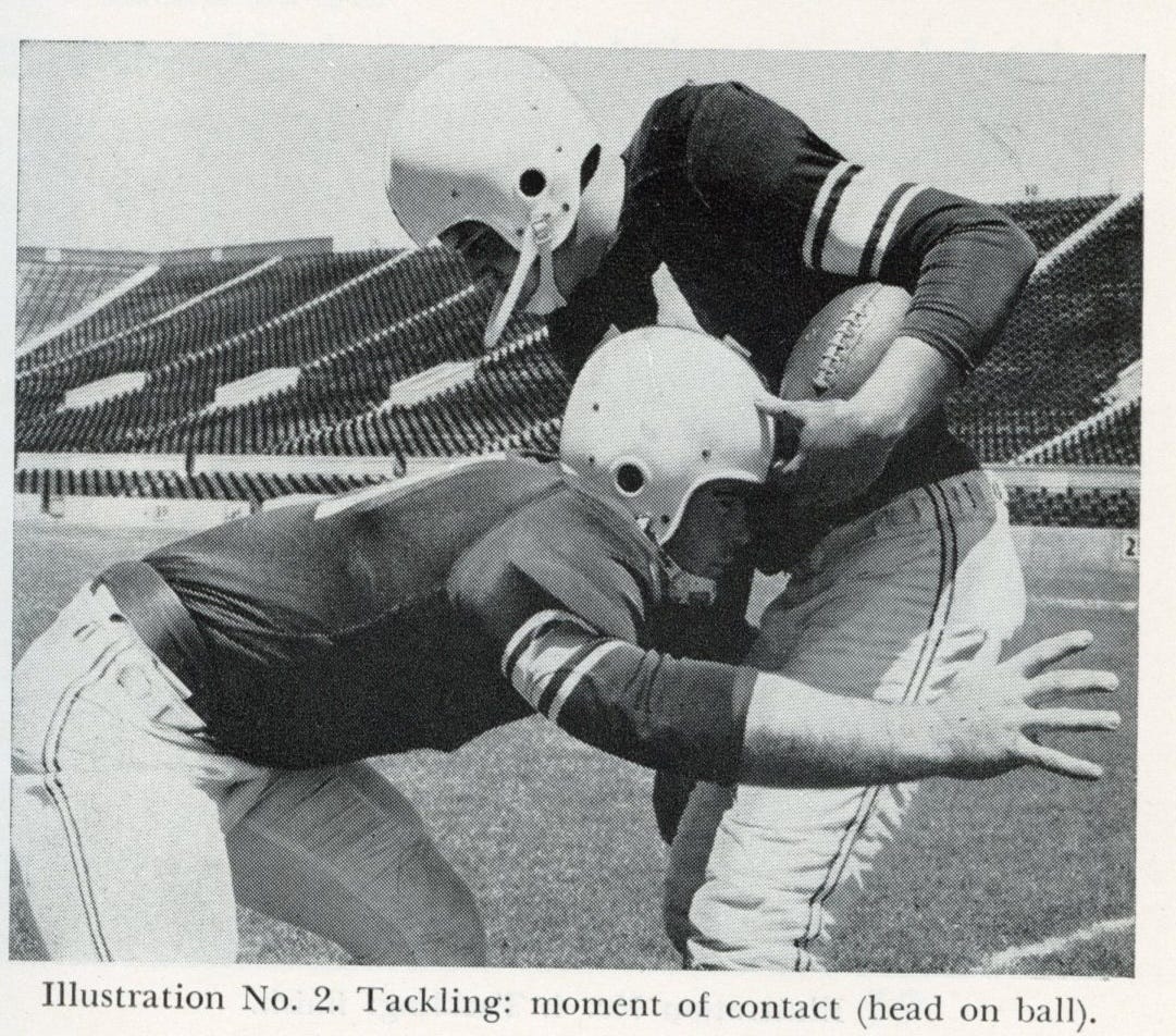 Second, the greater protection of plastic helmets and face masks prompted changes in blocking and tackling techniques. On defense, players were often taught to tackle by putting their head on the ball, which usually meant their aiming point was to one side of the ball carrier or the other, resulting in a shoulder tackle. However, things did not always work out that way on the field (similar to targeting today). Others taught players to tackle by planting their face in the opponent’s numbers, which was even more problematic. For these and other reasons, football saw an increase in deaths (e.g., 30 in 1961), leading to greater focus on safer helmets and playing techniques.