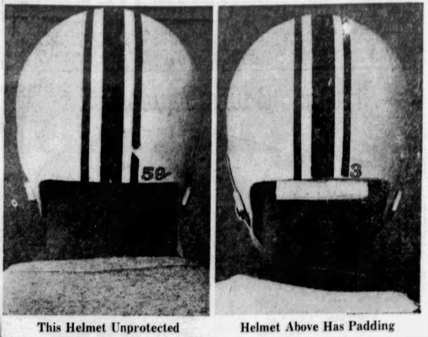 With that background, I searched for information on neck rolls, pads, collars, and similar terms. I found very little until the mid-1950s, when players with neck injuries or histories began wearing “protective collars.” Unlike devices used to aid recovery after an injury or surgery, players wore protective collars on the field, generally for what they described as pinched nerves.