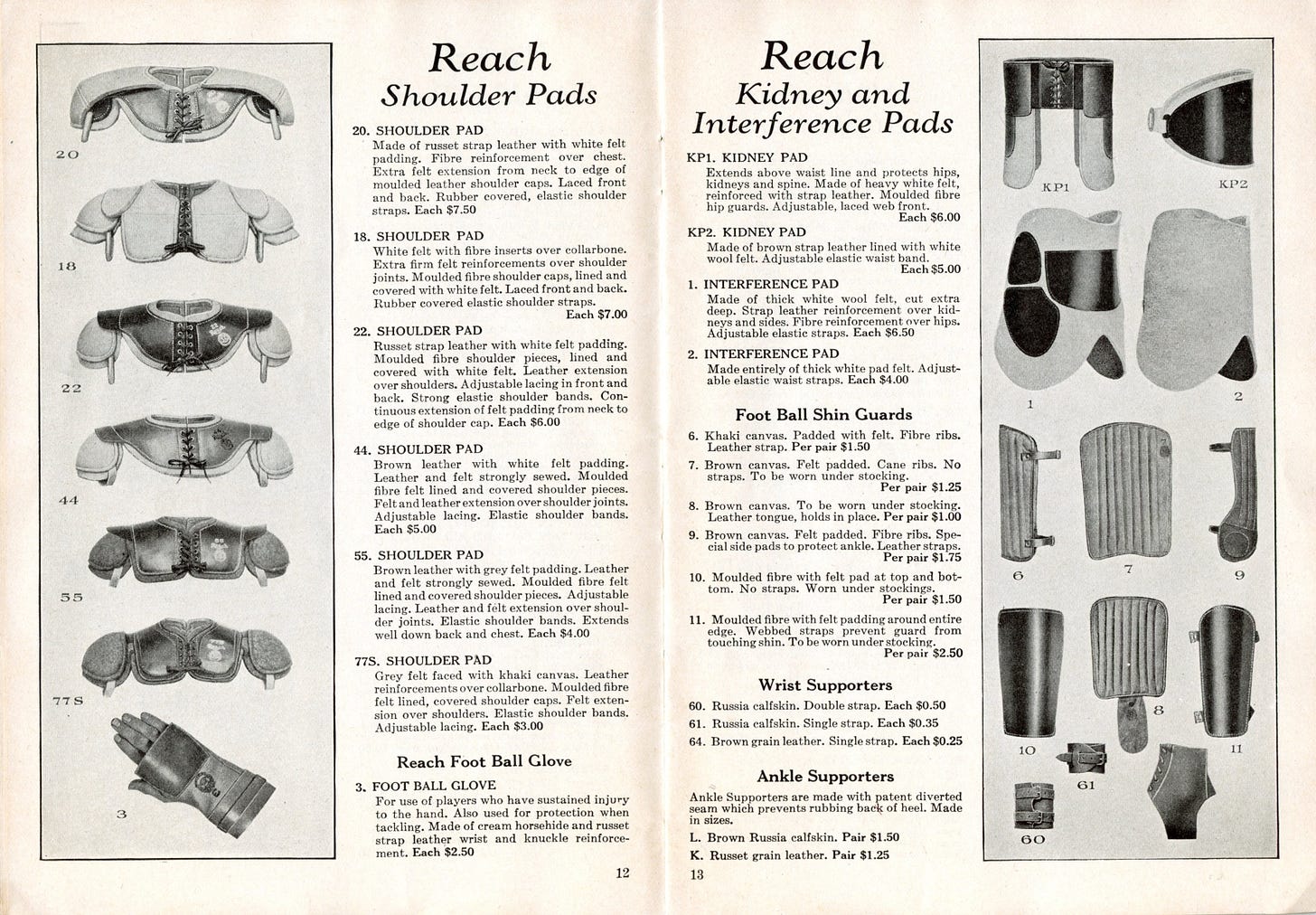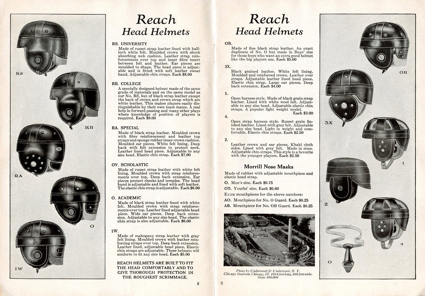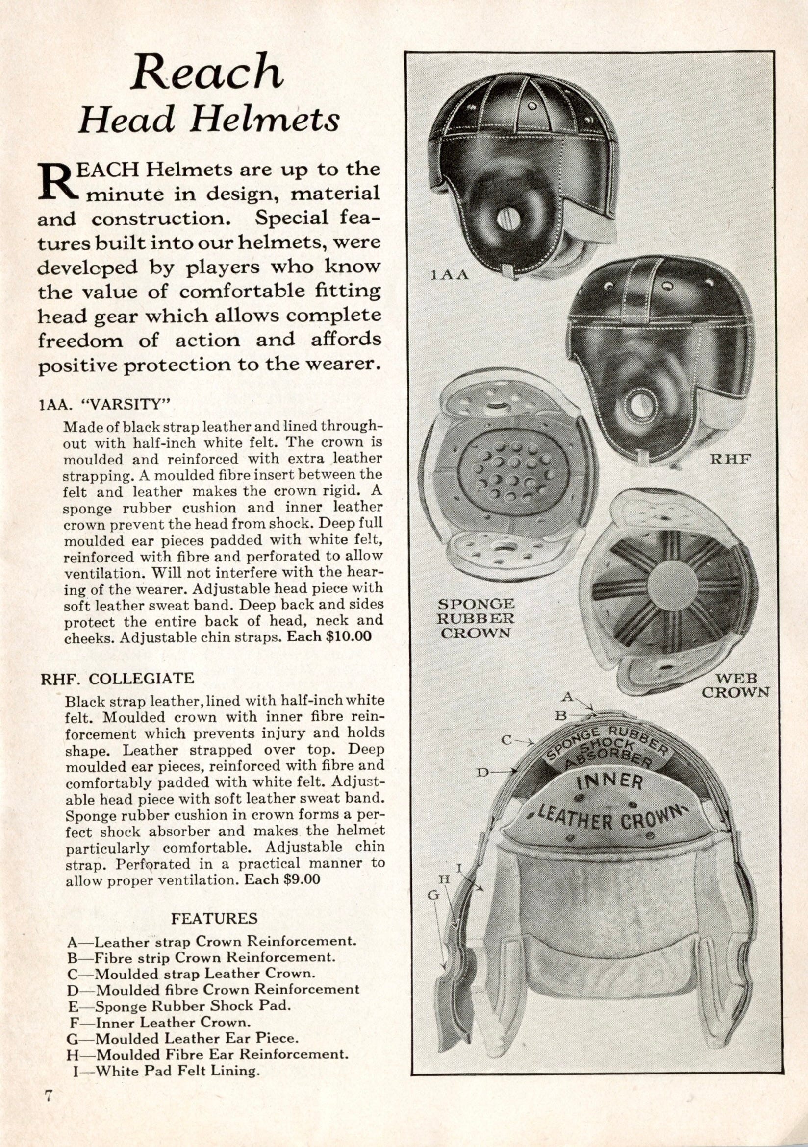 Then there were the helmets, which offered top-of-the-line protection against concussions and other head injuries. The 1AA model cost $10, just like Reach’s best Rugby Foot Ball, which is equivalent to $190 today. The 1AA was: