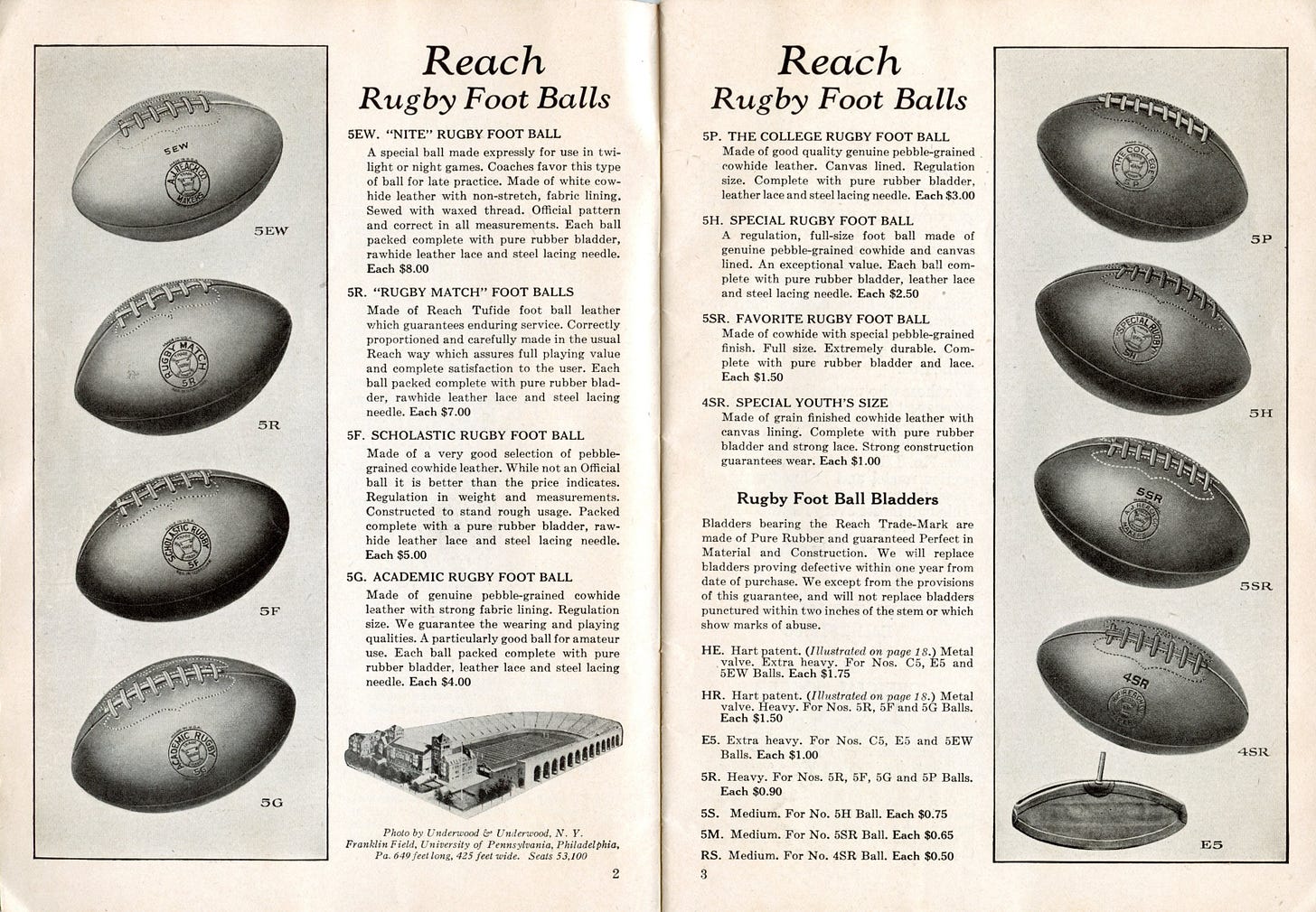 Below the $10 premium ball, Reach sold Rugby Foot Balls at many price points. They offered the 5EW “Nite” Rugby Foot Ball, made of white cowhide, which was great for late practices, and the earliest example of a commercially available night ball I recall seeing. The price of balls falls steadily until the nadir of the $1 youth ball, with a tough canvas lining that hopefully allowed for endless afternoons of play.