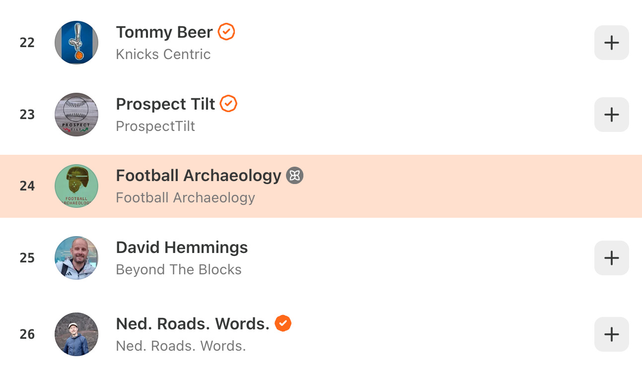 Nevertheless, their actions as faithful readers helped move Football Archaeology to #24 on Substack’s Rising Sports blog list.