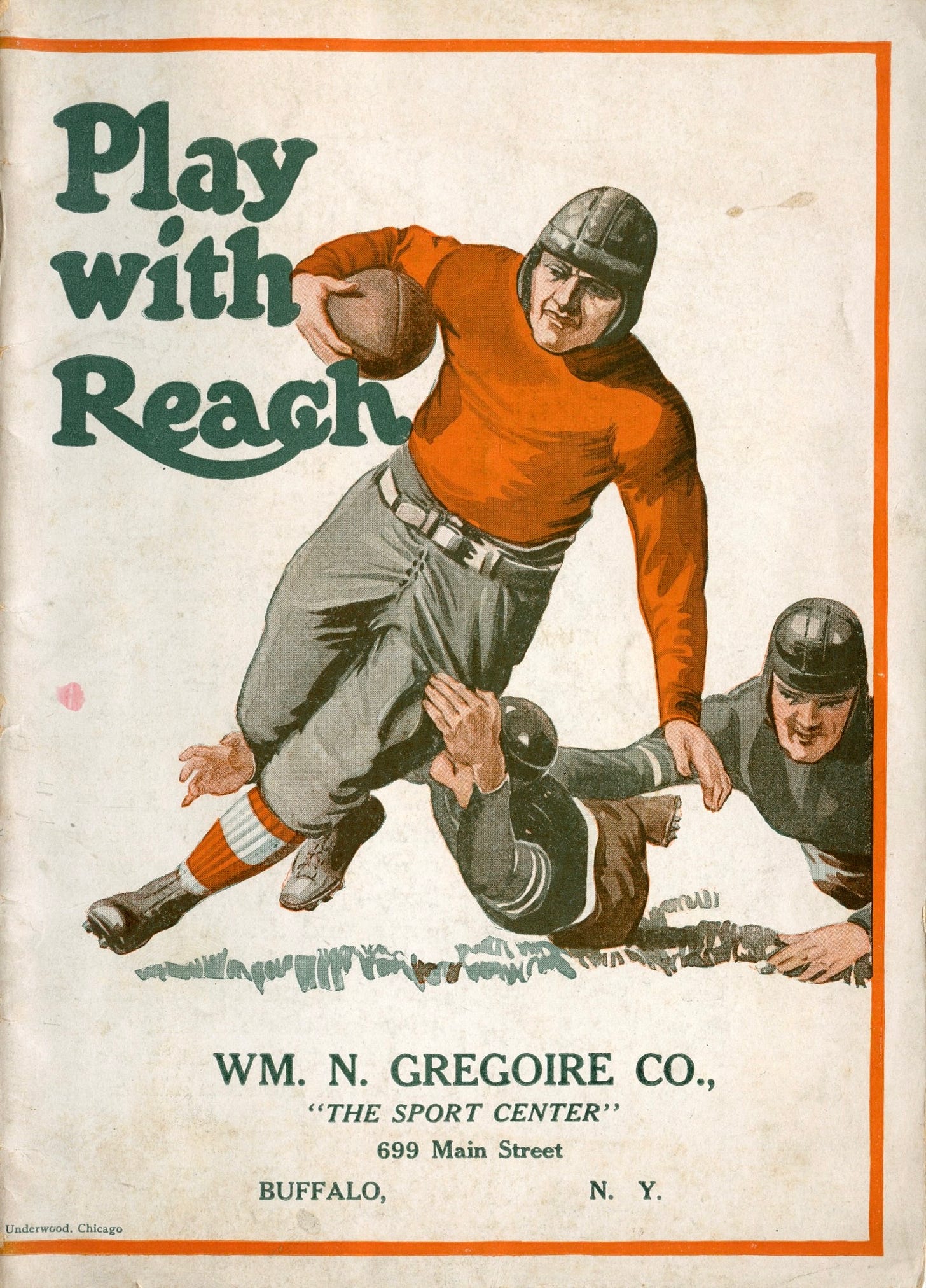A 1925 Reach catalog with its beautiful cover arrived in the mail today. The cover shows three players wearing the earth-tone gear of their day, along with splashes of red in the runner’s jersey and socks. Our runner evaded two tacklers, perhaps more, despite not carrying the ball high and tight as one should.
