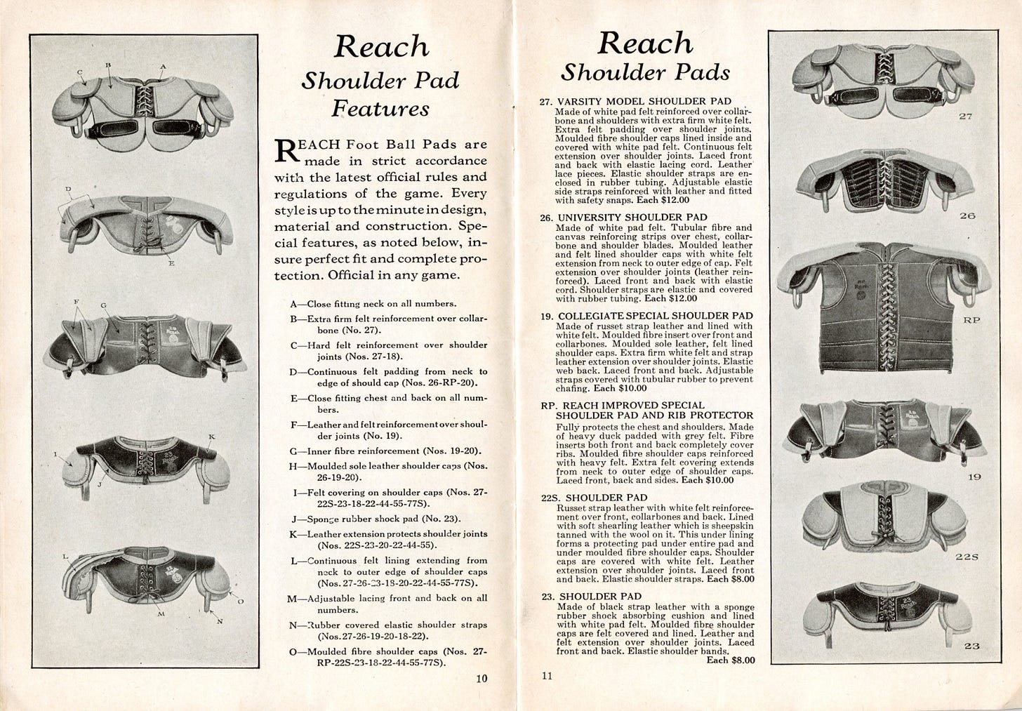 Then there were those pricey shoulder pads, topping out at $12 per. Two models are worth mentioning. One is the #27 Varsity, which, like the others, has armlet straps to keep the shoulder pads in place and side or chest straps that became the norm among future shoulder pads.